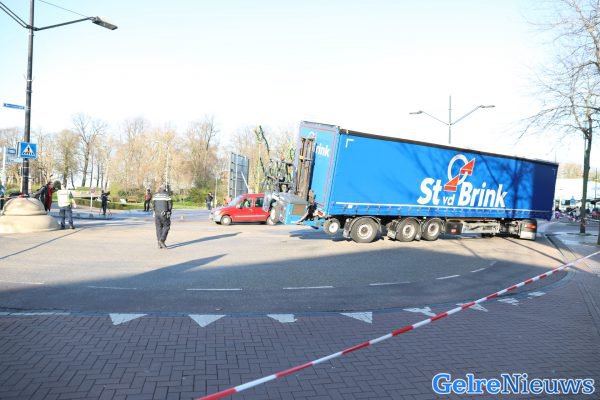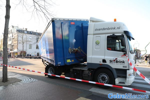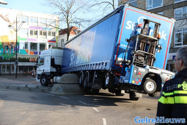 NIJMEGEN – Een vrachtwagen is ter hoogte van de Kelfkensbos in Nijmegen op een betonnen bol gereden met zijn trailer. Hierdoor dreigde even dat de vrachtwagen ging kantelen, maar inmiddels is dit niet meer het geval.