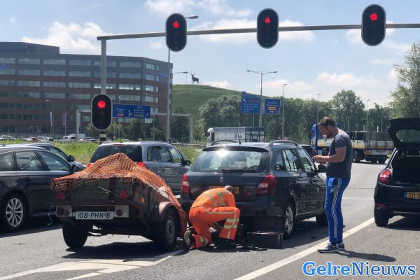 De auto met aanhanger reed op het Velperbroek toen de bestuurder voor een rood licht moest remmen. Een automobilist die dit iets te laat opmerkte botste achterop de aanhanger. Door de aanrijding brak de dissel van de aanhanger volledig af.