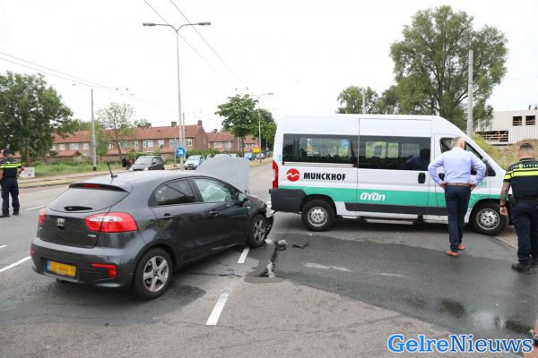 In het vervoersbusje zaten kinderen en de bestuurder. Iedereen kwam met de schrik vrij. De bestuurder van de personenauto raakte gewond en is per ambulance meegenomen naar het ziekenhuis.