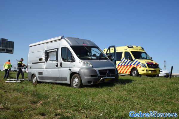 Die middag raakte de bestuurder van de camper door een nog onbekende oorzaak de macht over het stuur kwijt, waarna hij de berm in reed en een matrixpaal schampte. Een ter plekke gekomen ambulance heeft de inzittenden gecontroleerd op eventuele verwondingen, maar niemand hoefde naar het ziekenhuis.