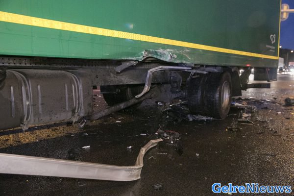 Het ongeluk gebeurde rond 6.30 uur. Een automobilist kwam door onbekende oorzaak in botsing met de zijkant van de vrachtwagen. De twee mannen in de auto raakte gewond. Beide zijn in verschillende ambulances meegenomen naar het ziekenhuis, waaronder één met spoed.