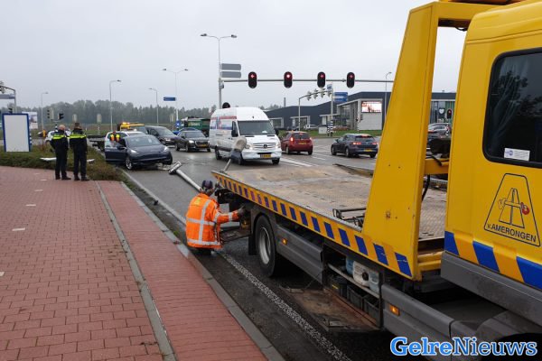 De schade is groot. De auto is geborgen door een bergingsbedrijf. De bestuurder kwam met de schrik vrij. Het ongeluk trok veel bekijks.