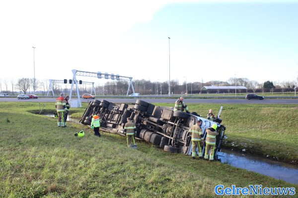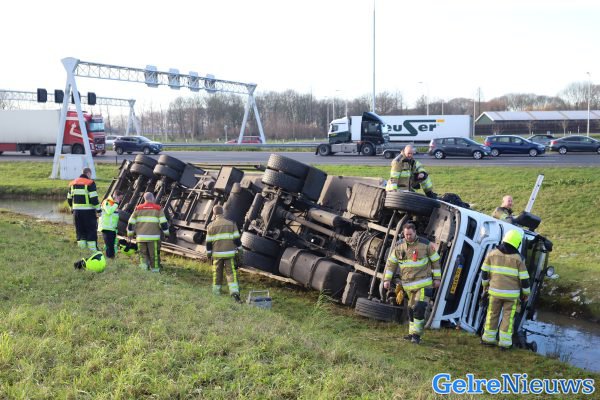 Hoe het ongeval kon gebeuren, is niet bekend. Een berger zal de vrachtwagen weer rechtop zetten en vervolgens afvoeren.