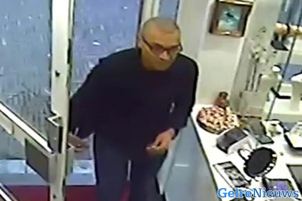 Op de beelden is te zien hoe hij vervolgens een greep deed in de vitrines met sieraden. Het slachtoffer wist zich in de tussentijd los te wrikken en rende naar buiten voor hulp.