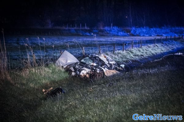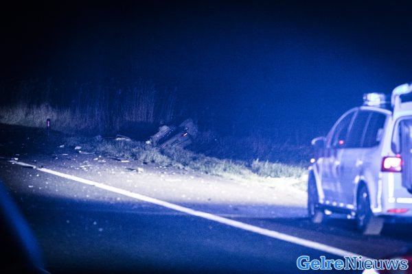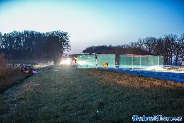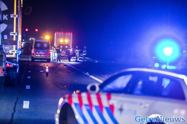 Een personenauto is met hoge snelheid achterop tegen vrachtwagen geknald. Hierbij zijn twee dodelijke slachtoffers gevallen. Één van de inzittende van de auto is op de vlucht. Volgens de politie van de Landelijk Eenheid zou het gaan om plofkrakers, de politiewoordvoerder kan dit nog niet bevestigen. Wel geven zij aan dat er wordt onderzocht wordt of er een verband is met dit ongeval en een plofkraak eerder in de nacht in Duitsland. De politiehelikopter zoekt in de omgeving naar de derde inzittende.