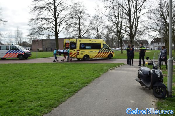 Het ongeluk gebeurde ter hoogte van het bruggetje. Beide reden in dezelfde richting maar kwamen door onbekende oorzaak met elkaar in aanraking, waarna ze ten val kwamen. De man op de scooter raakte bij de val gewond en is per ambulance overgebracht naar het ziekenhuis. Wat zijn letsel is, is niet bekend. De fietser kwam met de schrik vrij.