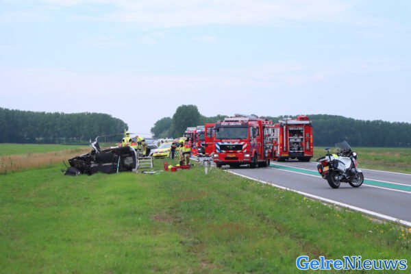 Het ongeluk werd rond 13.15 uur gemeld. Onder andere zeven ambulances en twee traumahelikopters werden gealarmeerd. Twee auto’s kwamen met elkaar in botsing, vermoedelijk door een inhaalmanoeuvre. Dit maakte de politie zondagavond bekend. Één van de voertuigen is op zijn zijkant tot stilstand gekomen. De gewonden, drie mensen zoals later bleek, zijn met met de ambulance met spoed overgebracht naar het ziekenhuis.