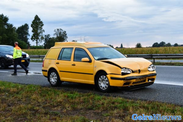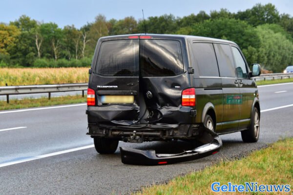 Een gele auto reed achterop de loempiakraam, die werd getrokken door een bestelbus. De loempiawagen schoot los en belandde in de vangrail. Tijdens het takelen ging het loket open, waardoor alles op de rijbaan terecht kwam. De schade is groot. Beide bestuurders kwamen met de schrik vrij.