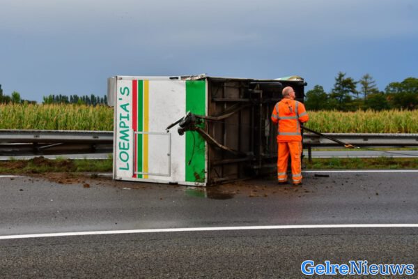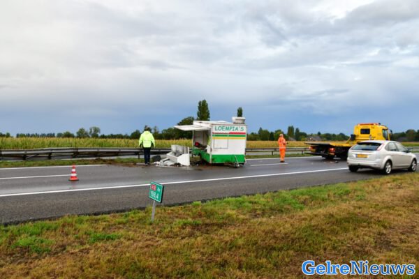 WEHL – Op de snelweg A18 tussen Wehl en Doetinchem is een loempiakraam op zijn kant tot stilstand gekomen bij een ongeluk.