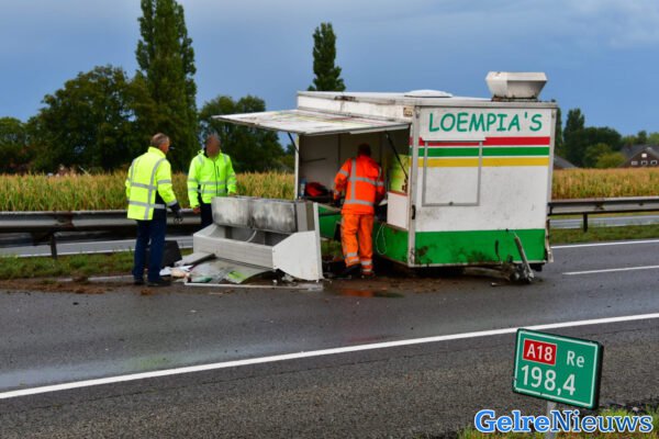 Loempiakraam op zijn kant na ongeval op A18