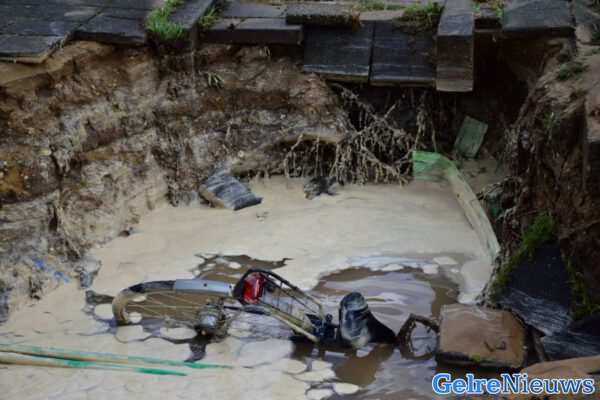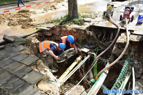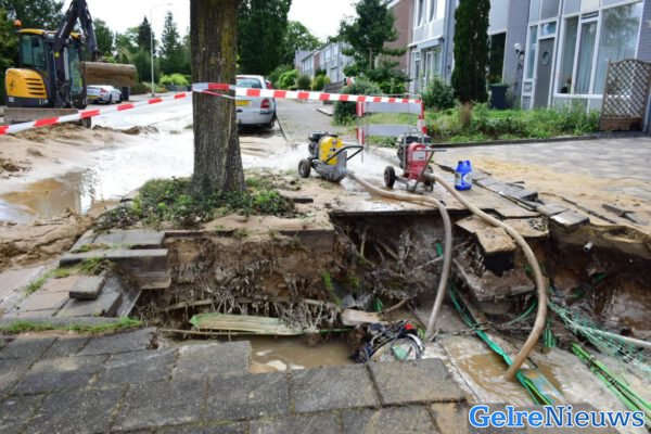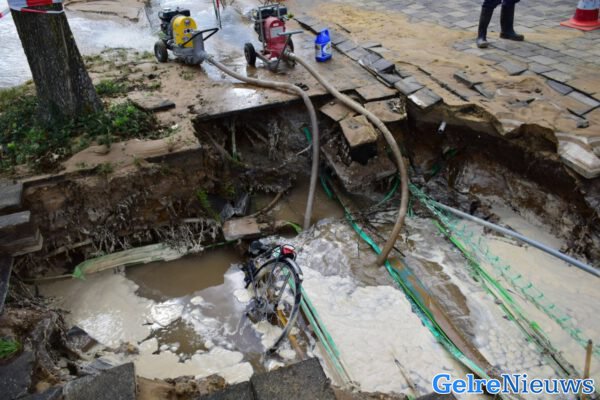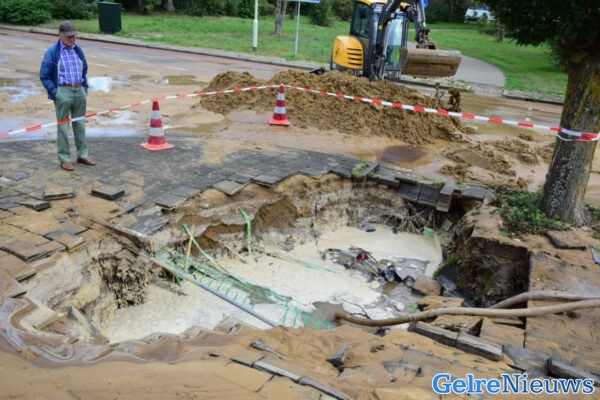 Een boom die naast de sinkhole stond, is gekapt omdat er een te groot gevaar was dat deze zou gaan omvallen. De jongeman kwam er verder met een nat pak er goed van af.