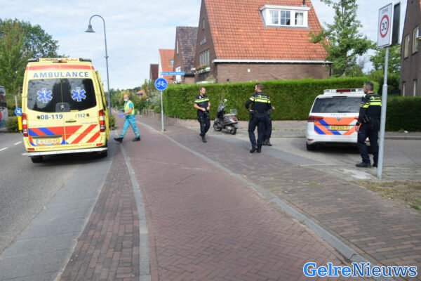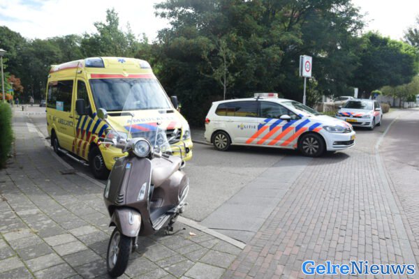 De vrouw van scooter is met onbekend letsel meegenomen naar ziekenhuis. Bestuurster van de auto kwam met de schrik vrij.