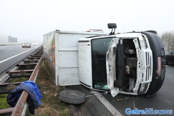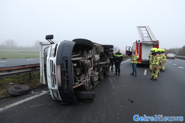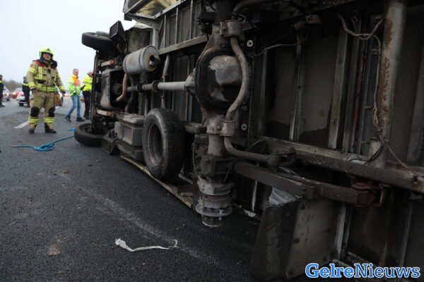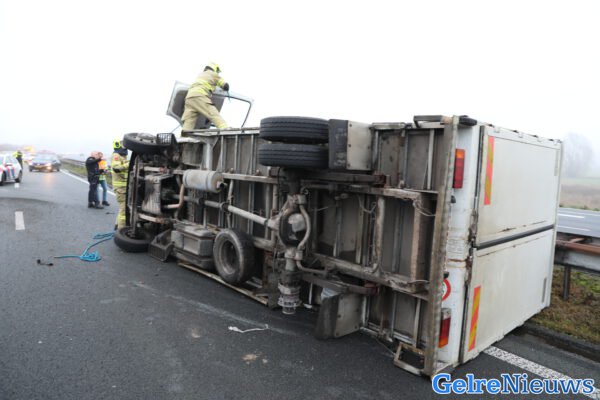 Bestel vrachtwagen gekanteld bij ongeval A348