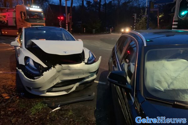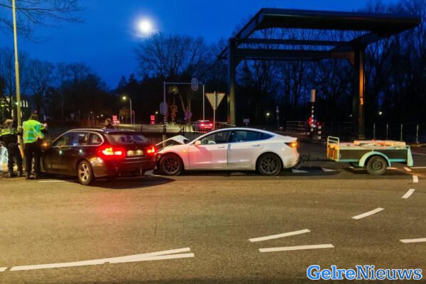 HALL – Op de Dierenseweg langs het kanaal bij Hall zijn maandag aan het eind van middag een BMW auto en een Tesla auto met elkaar in botsing gekomen.
