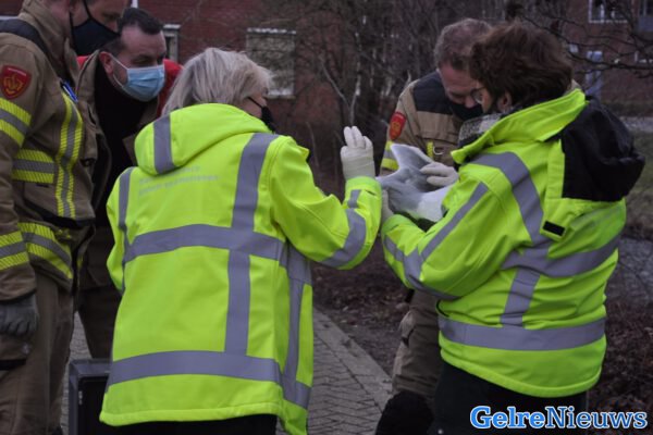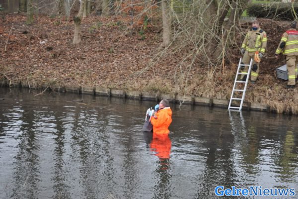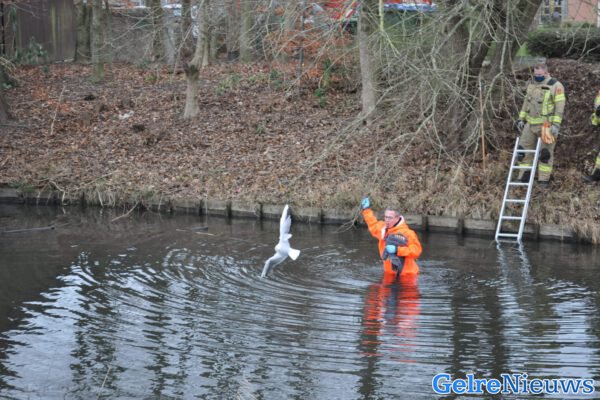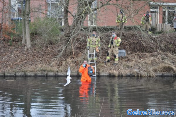 De brandweer werd hiervoor iets na 15:00 uur opgeroepen, waarna de brandweerwagen van Duiven ter plekke kwam. Ook de dierenambulance uit Arnhem kwam ter plekke. Brandweerlieden zijn vervolgens met waadpakken het water in gegaan, waar ze de vogel konden bevrijden. De dierenambulance heeft de zorg van het dier na de reddingsactie weer overgenomen.