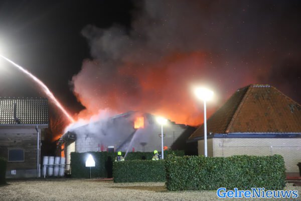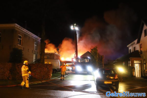 De brandweer kwam met veel wagens ter plaatse en kon water uit het naastgelegen rivier De Linge halen.