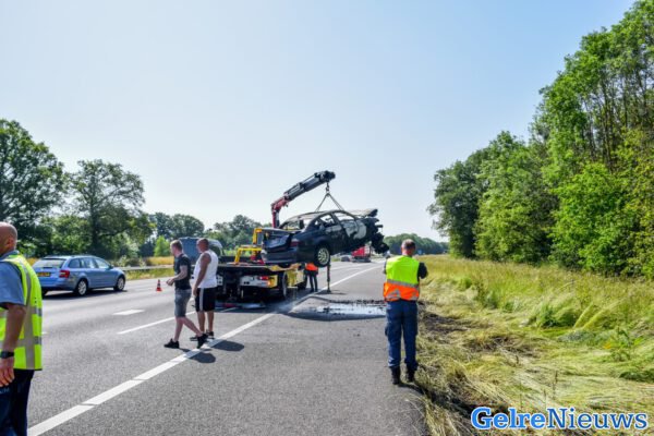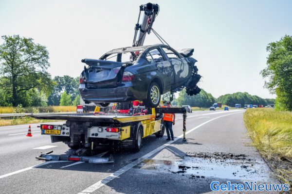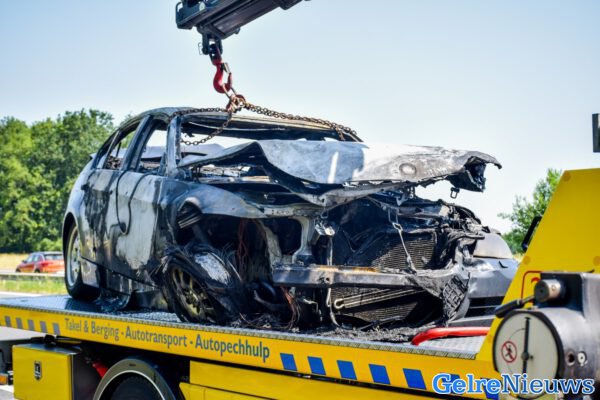 De bestuurder en bijrijder raakten niet gewond. Tijdens de brand ontstond er een file omdat er een rijstrook was afgesloten.