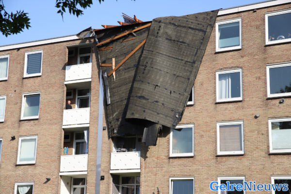Vele schademeldingen in Tiel, waaronder een flat aan de Hertog Arnoldstraat. Daar was het dak er bijna volledig afgewaaid. Een stuk van het lerendak kwam in de lucht en is op een woonblok er tegenover terecht gekomen, op de Hertog Adolfstraat. Hierdoor waren diverse ramen van woningen kapot gegaan. Ook de tuin ligt in diggelen.