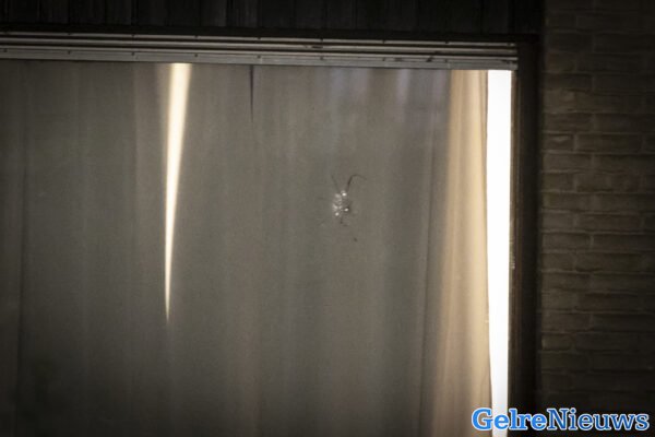 Rond 23.30 uur belden meerdere mensen met 112 nadat er schoten waren gehoord. De politie ging groots ter plaatse en agenten droegen zware kogelwerende vesten voor hun eigen veiligheid. In een raam is zeker één gat te zien.