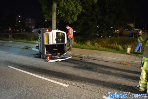 Bestelbus op zijnkant: inzittenden slaan op de vlucht