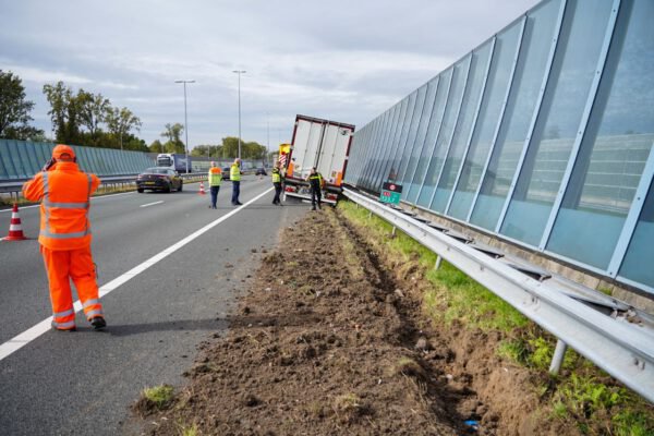 Het ongeluk gebeurde rond 13.20 uur. Door onbekende oorzaak raakte de chauffeur met zijn vrachtwagen van de weg en botste met de zijkant tegen de vangrail, waarna het voertuig tot stilstand kwam. De trailer van de vrachtwagen zit vol met hangend vlees.
