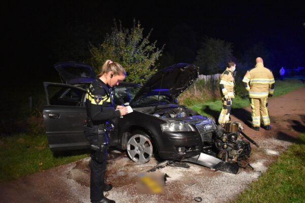 De motor van de auto kwam door de klap los uit het voertuig, deze lag voor het voertuig. De bestuurder kwam wonder boven wonder uit het voertuig zonder ernstige verwondingen. De man had niet gedronken en verklaarde te hard te hebben gereden. Het voertuig raakte total loss.