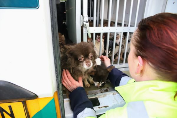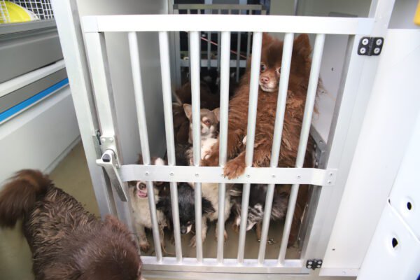 De chihuahua’s zaten vastgebonden aan een houten paal met dunne touwtjes, zo meldt de fotograaf ter plekke. De dierenambulance kwam met twee busjes om de hondjes uit de benarde positie te bevrijden. Met een schaar waren de dunne touwtjes simpel door te knippen.