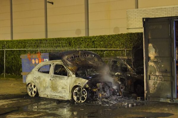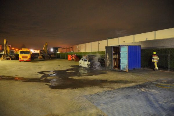 De brandweer en politie werden rond 04:30 uur gebeld. Ter plaatse stonden op een bedrijventerrein, naast een container, twee auto’s in lichterlaaie. De twee auto’s zijn compleet uitgebrand. De buitenkant van de container was zwart geblakerd, maar de materialen binnen, waaronder een houten tafel, raakten niet in brand.