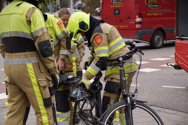 De brandweer heeft de accu van de fiets los geknipt. De vrouw is nagekeken door het ambulancepersoneel, maar hoefde niet mee naar het ziekenhuis.