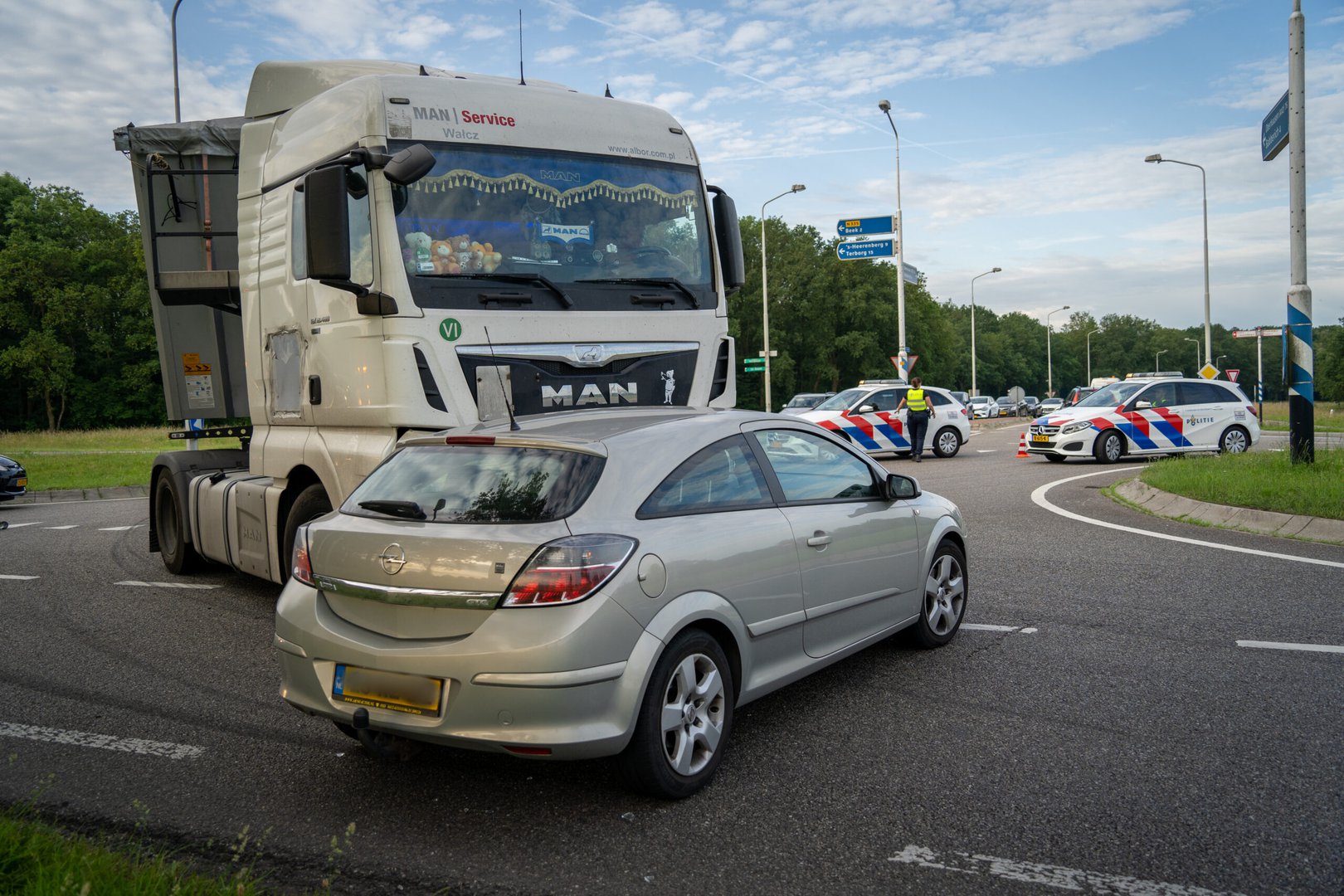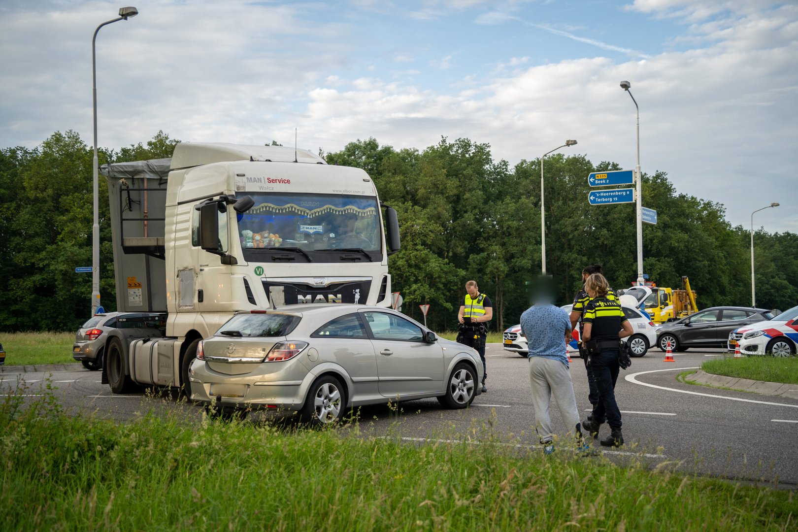 BEEK – Een auto is vrijdagochtend enkele meters meegesleept door een vrachtwagen op de Arnhemseweg N335 in Beek.