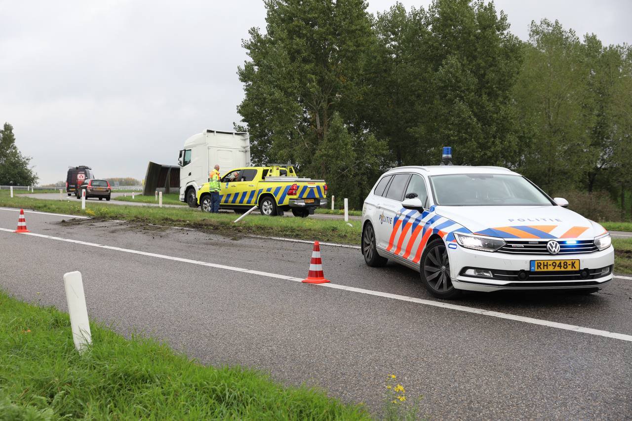 Een bergingsbedrijf heeft de auto afgesleept. Rijkswaterstaat gaat met een SOAB cleaner het wegdek schoon maken.