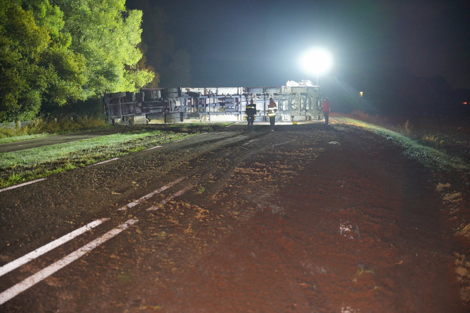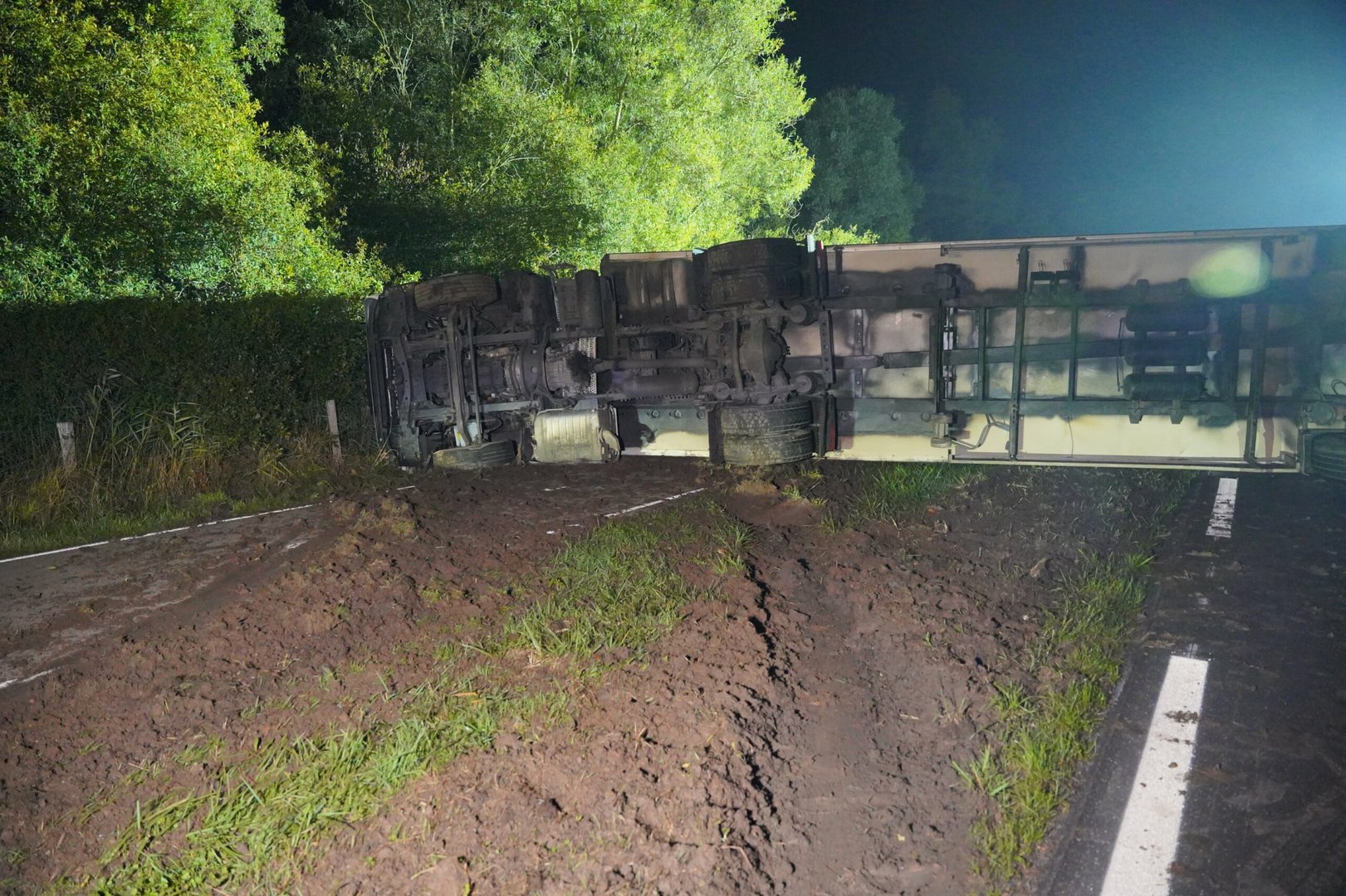 Toen de hulpdiensten arriveerde troffen zij een gekantelde vrachtwagen aan. Het voertuig lag in de struiken, over een fietspad en over twee rijbanen. Hierdoor is de weg geheel geblokkeerd. De bestuurder van de vrachtwagen is met de schrik vrijgekomen.