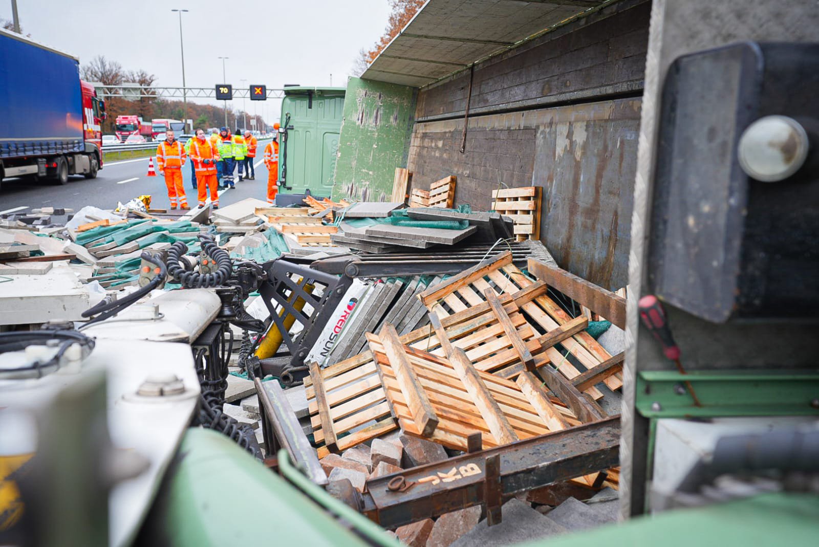 De chauffeur raakte gewond en is naar het ziekenhuis gebracht. De vrachtwagen is geborgen en het wegdek is gereinigd.