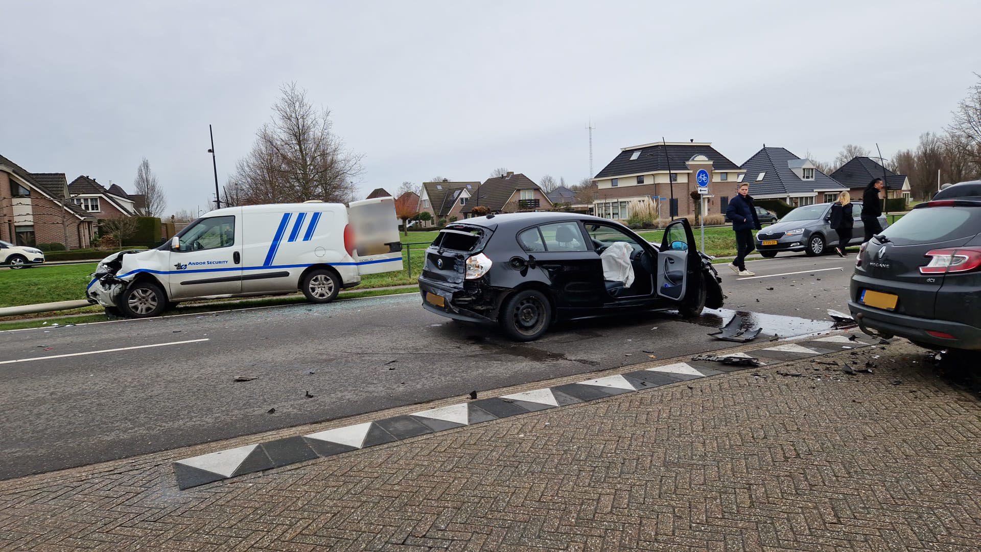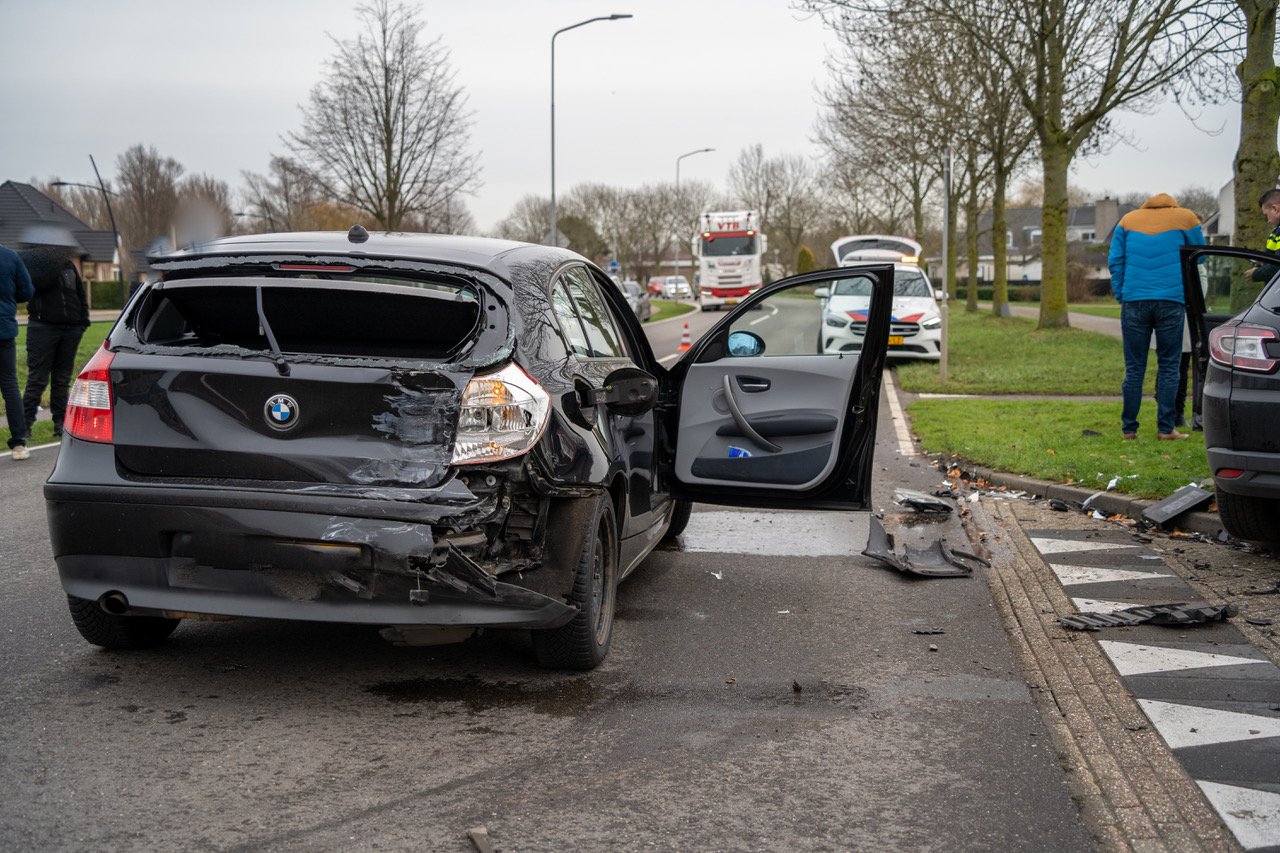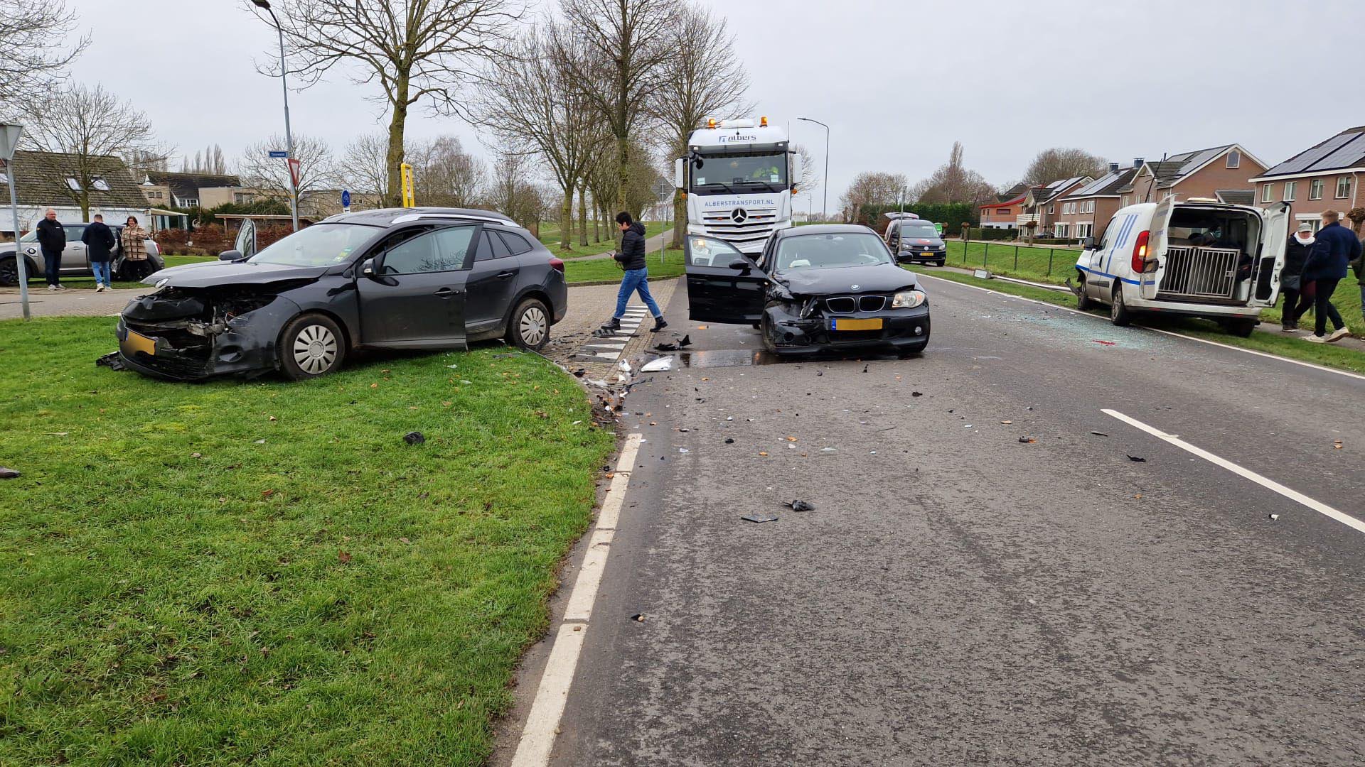 Een auto die stil stond op de kruising om de Tasveld op te draaien is van achteren aangereden door een auto die dit te laat opmerkte. De afslaande auto schoot hierbij op de verkeerde weghelft en botste frontaal op een tegemoet komende auto.