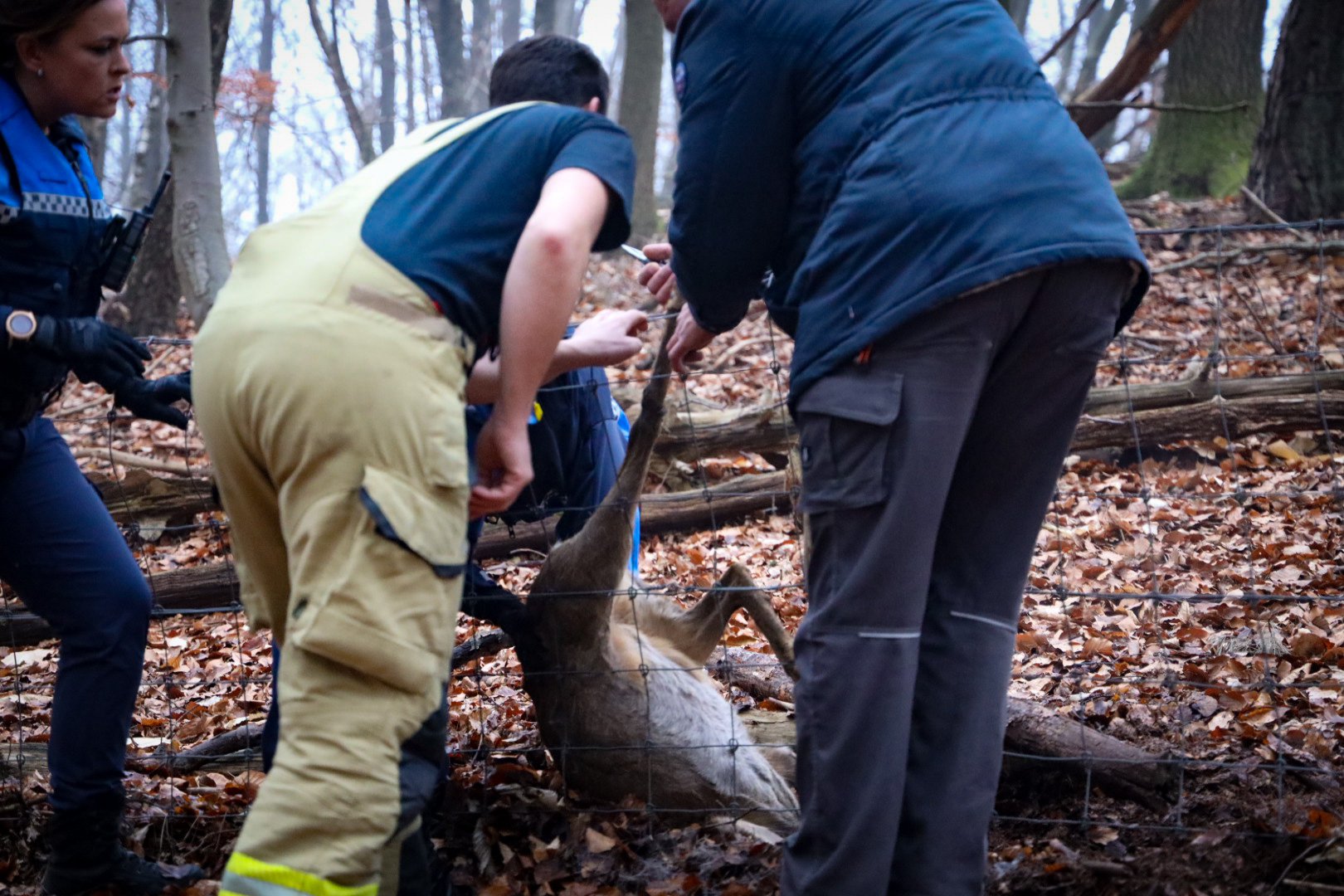 Ree vast in het raster, brandweer en handhaving redden het dier