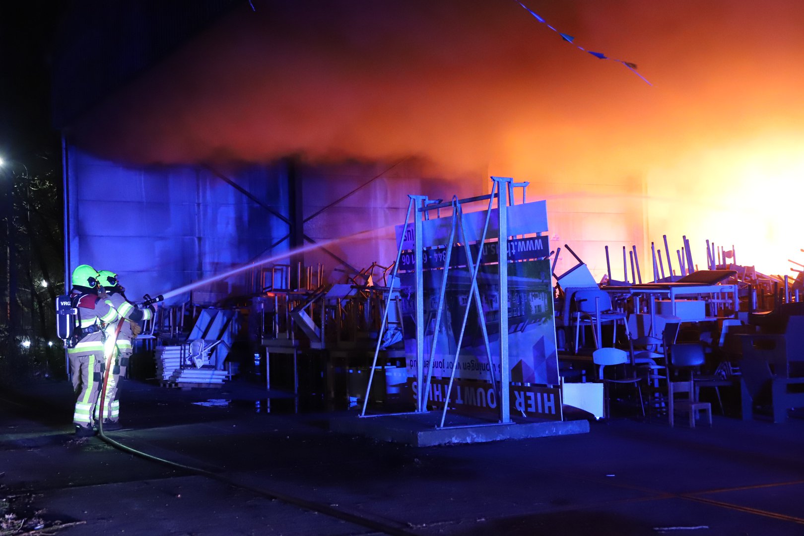 Het bleek te gaan om een flinke brand in een open loods, waarbij een grote hoeveelheid stoelen en tafels in brand stonden. De brandweer schaalde direct op naar middelbrand, waarbij ook de hoogwerker werd ingezet aan de achterzijde van het pand.