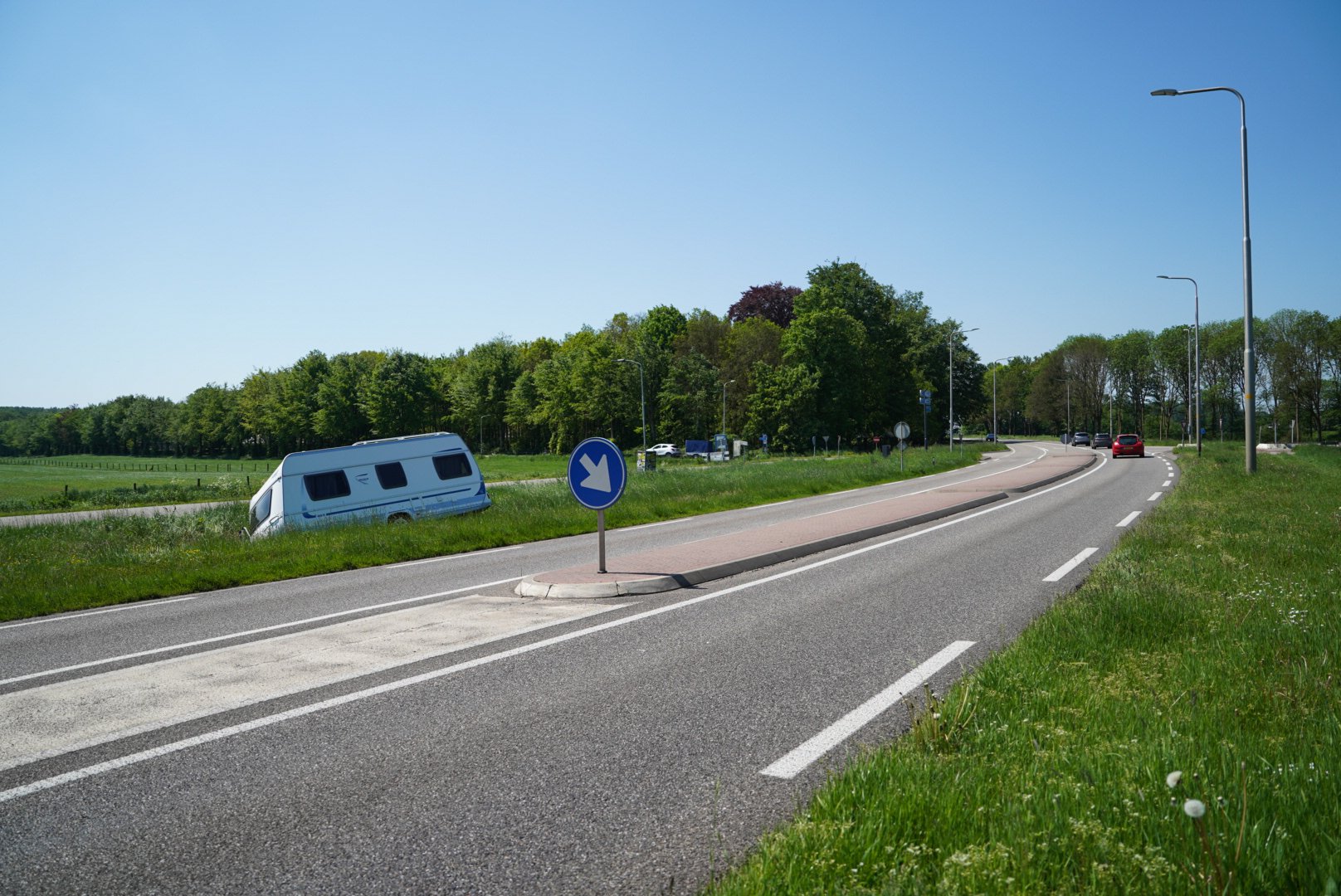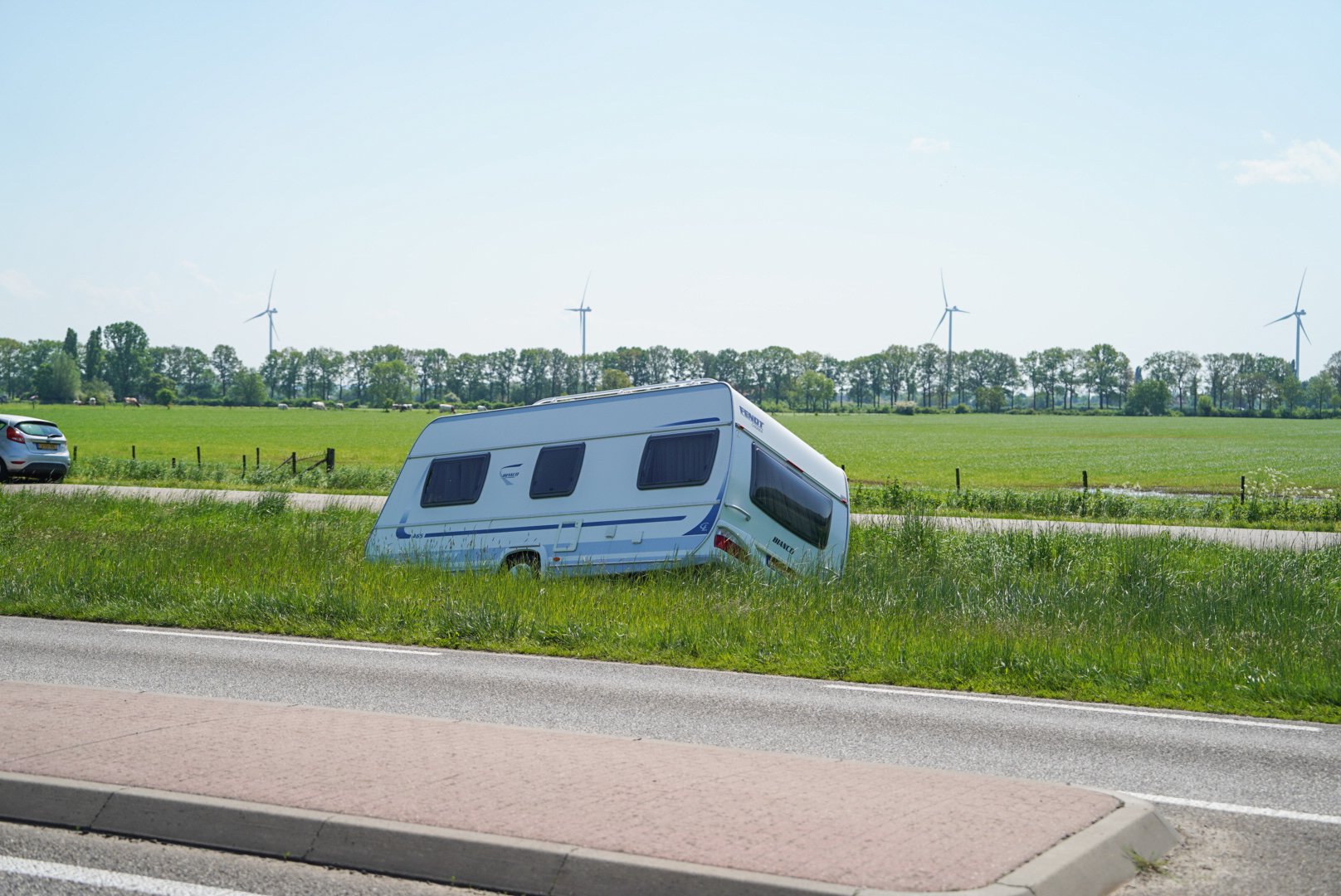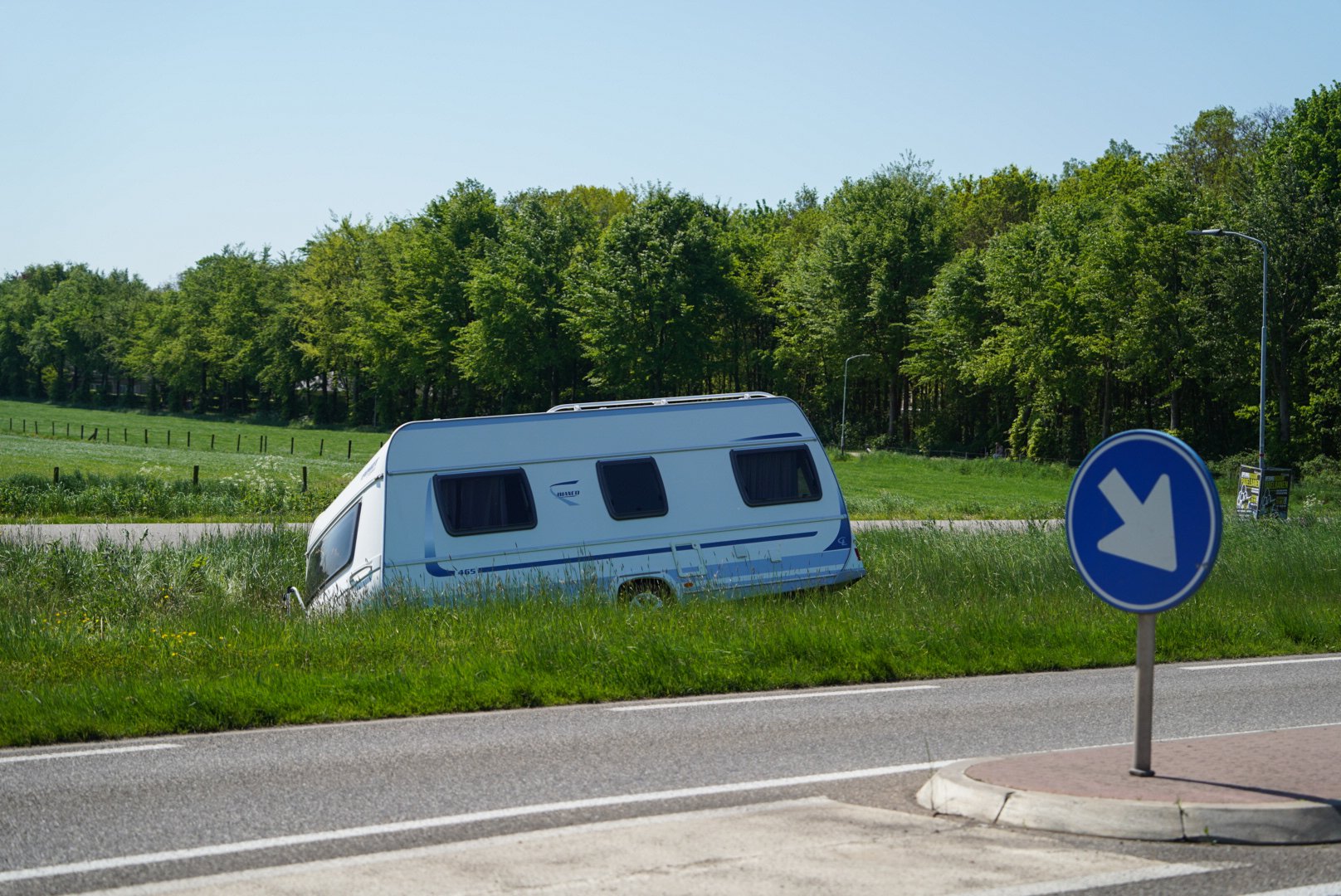 De eigenaren zijn zelf een kraan aan het regelen om de caravan rechtstandig uit de greppel te takelen in de hoop dat dit geen extra schade oplevert aan de caravan.