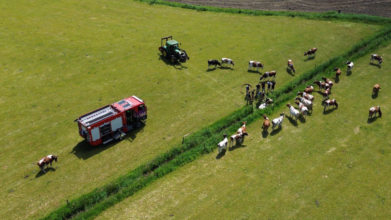 Rond 12:15 uur ontdekte de boer dat de drachtige koe in de greppel lag en belde de brandweer.