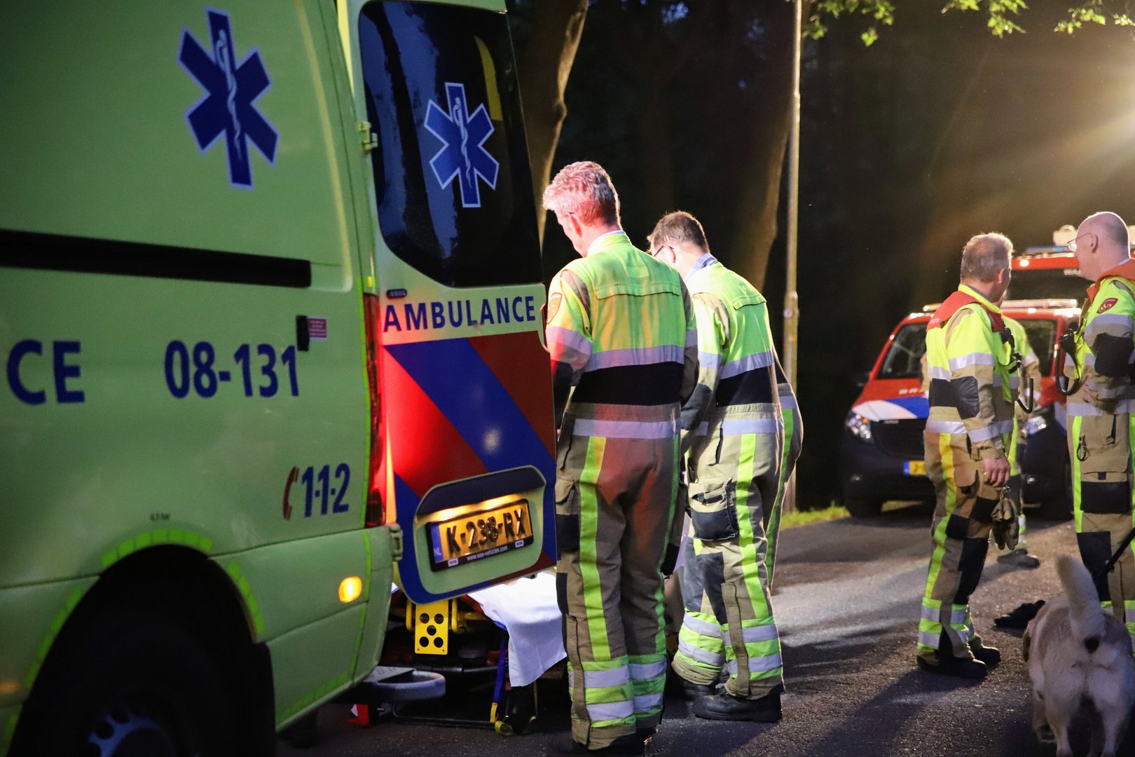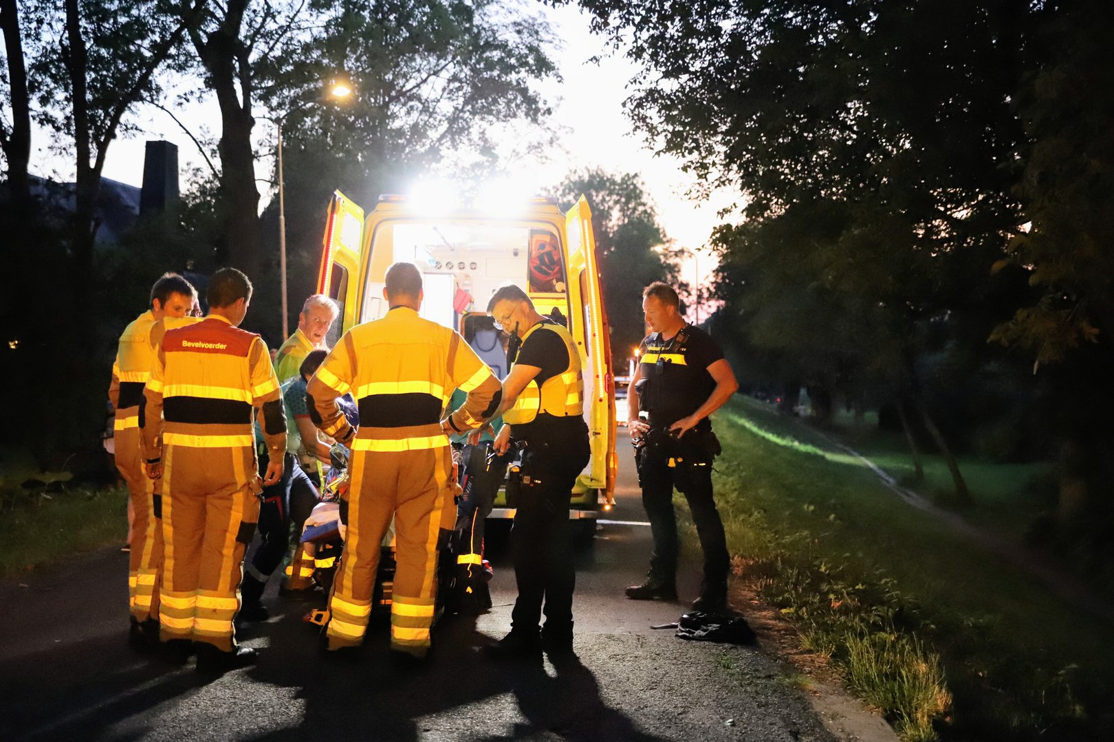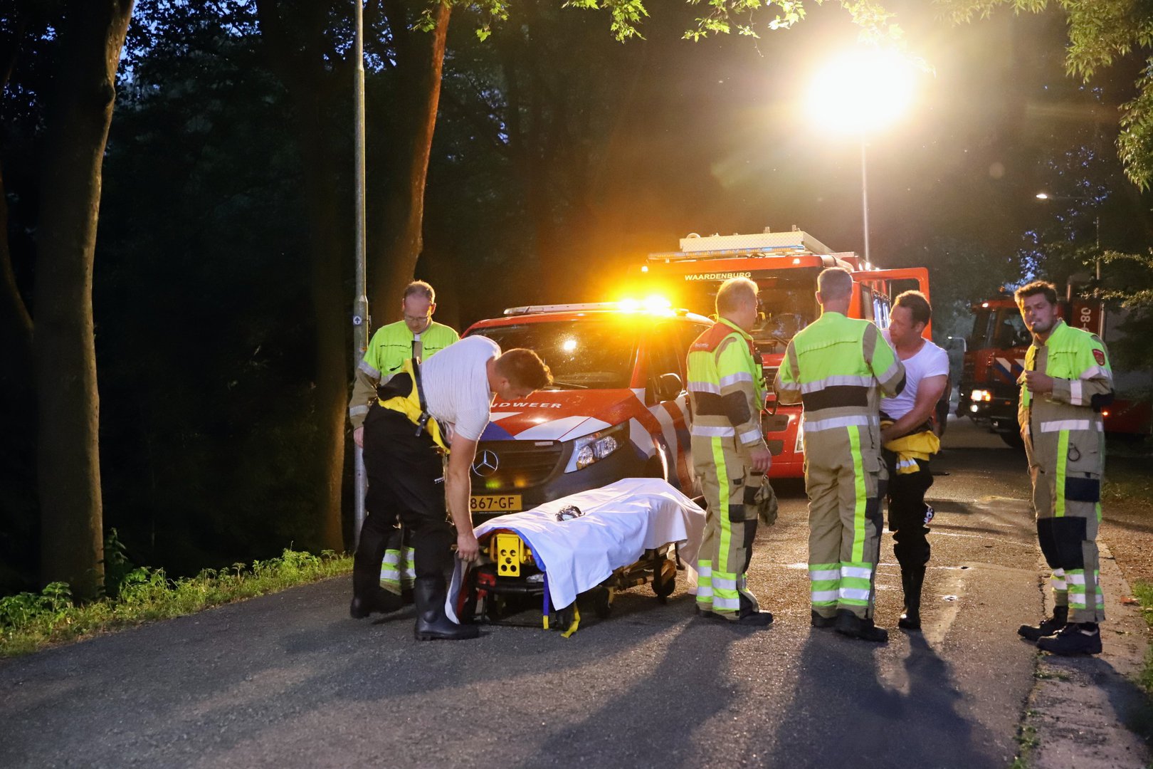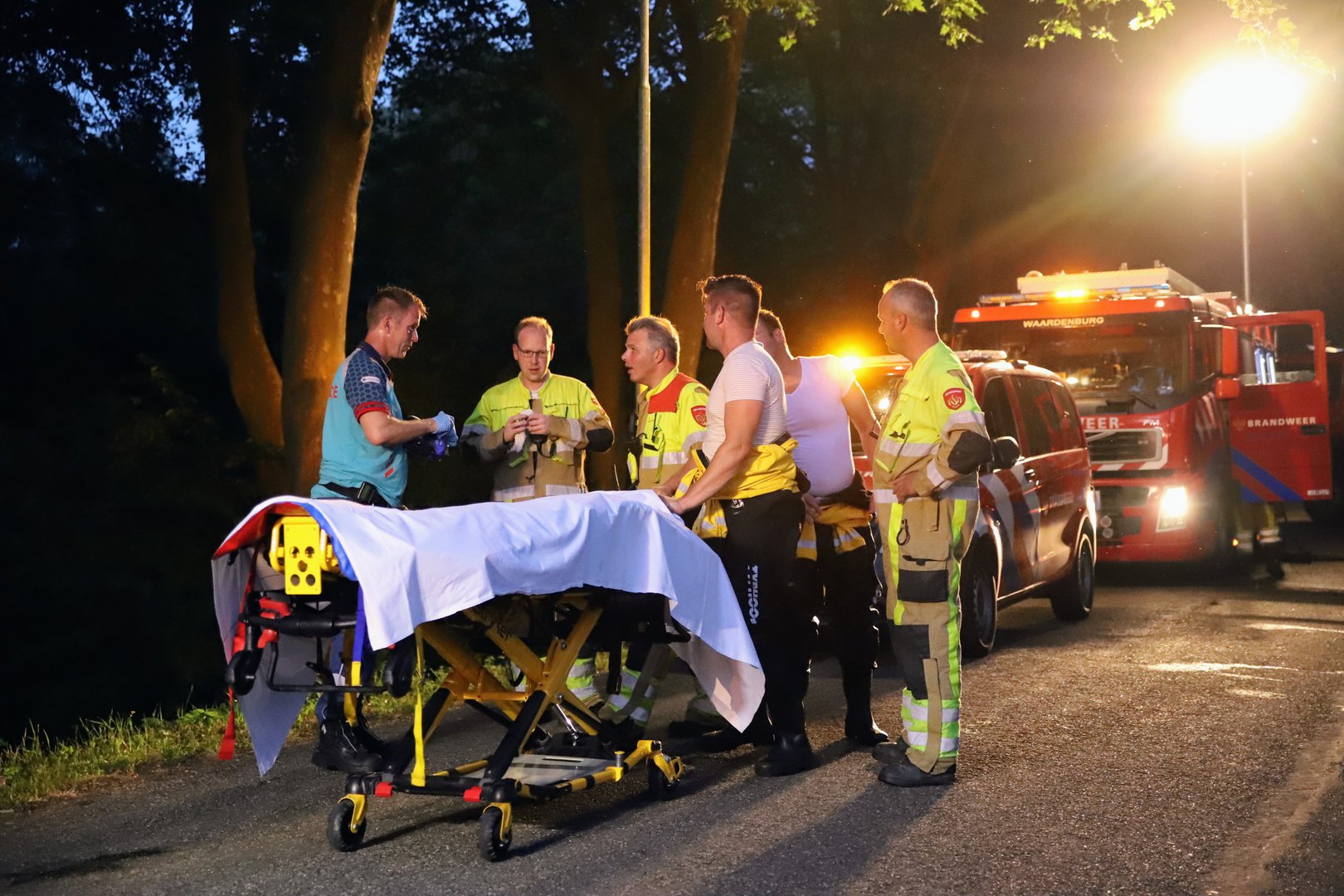 De jongeman was onderkoeld en kreeg een isolatiedeken om. Vervolgens werd hij op een brancard naar een ambulance gedragen en met spoed naar het ziekenhuis vervoerd. De aard en ernst van zijn verwondingen zijn onbekend. Het is ook niet duidelijk hoe hij in de boom en uiteindelijk in het water terecht is gekomen.