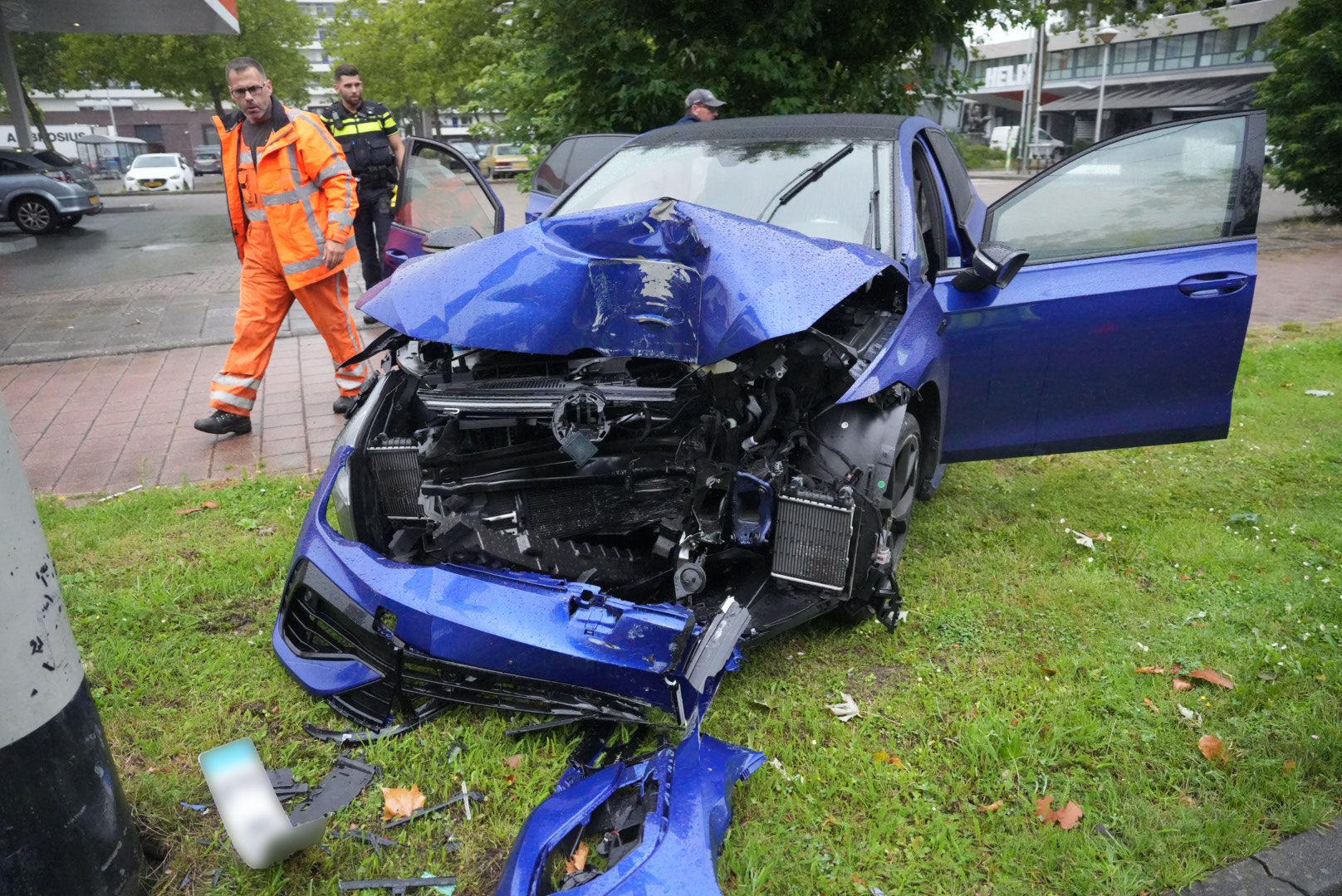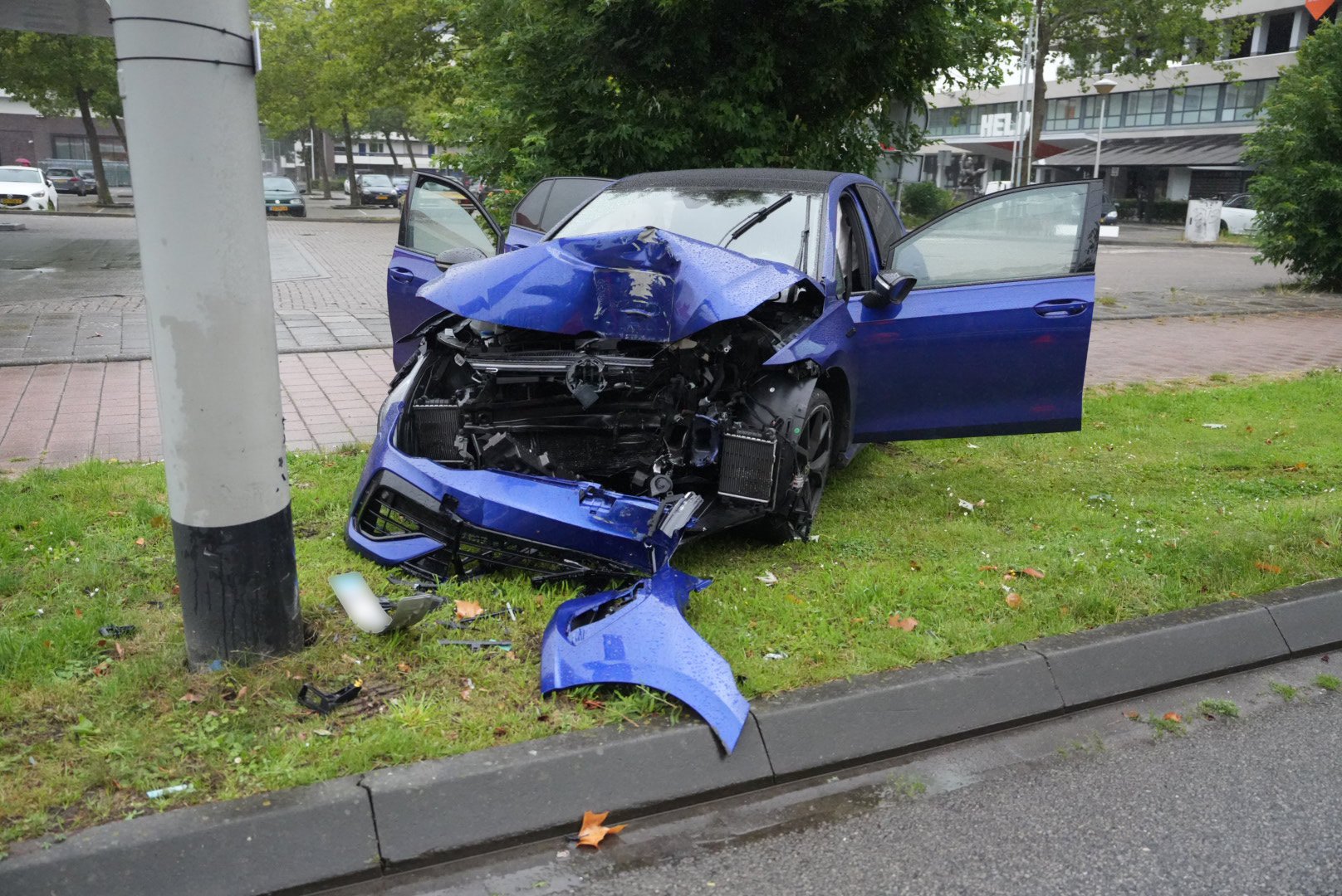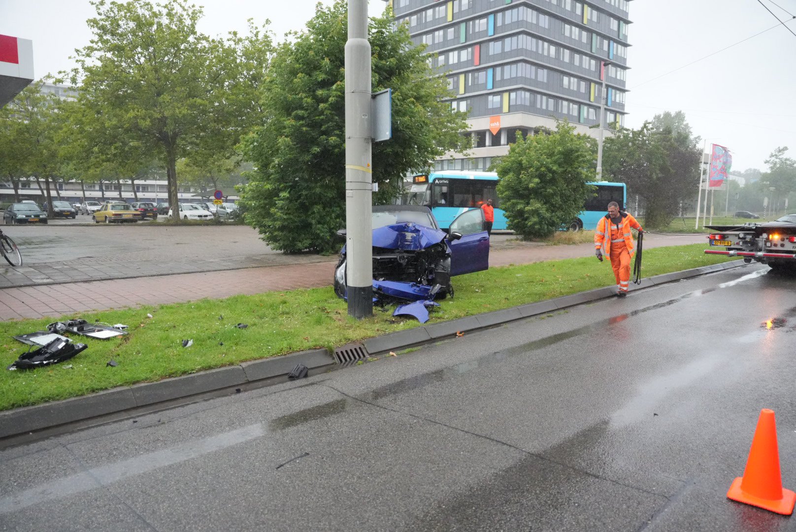 Auto total loss na aanrijding met trolleybusmast in Arnhem