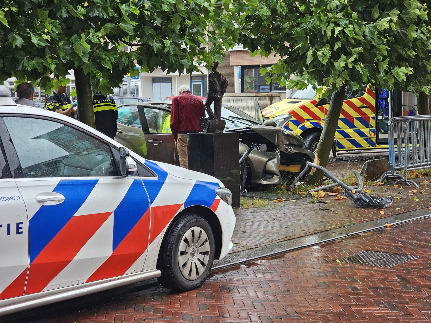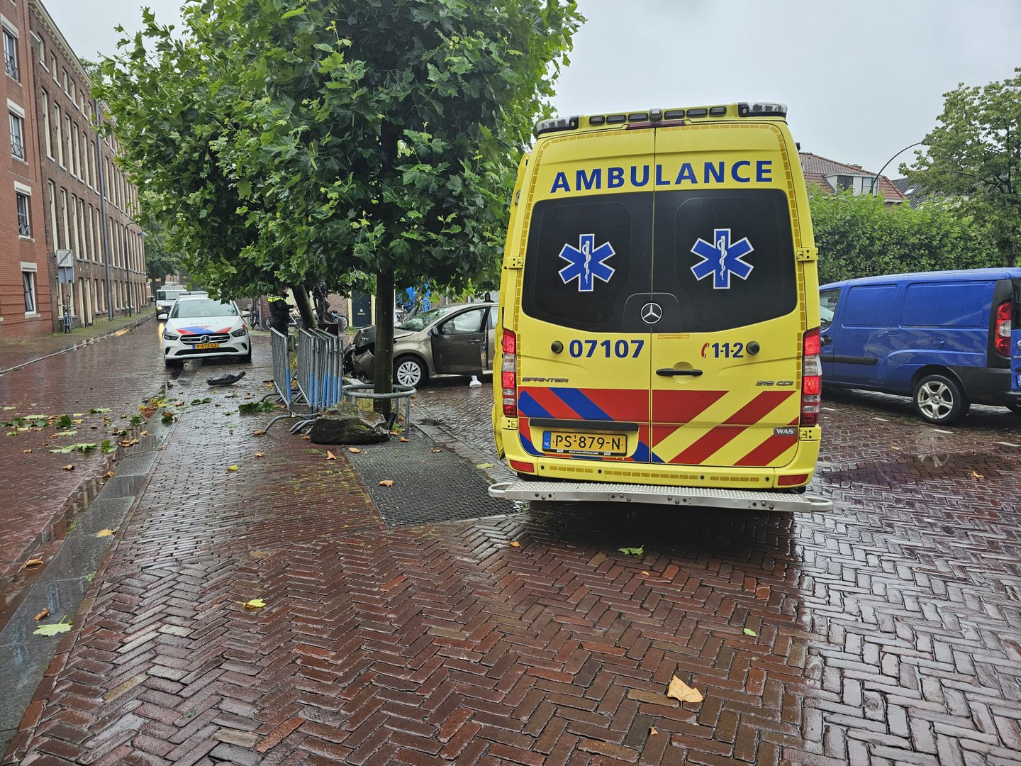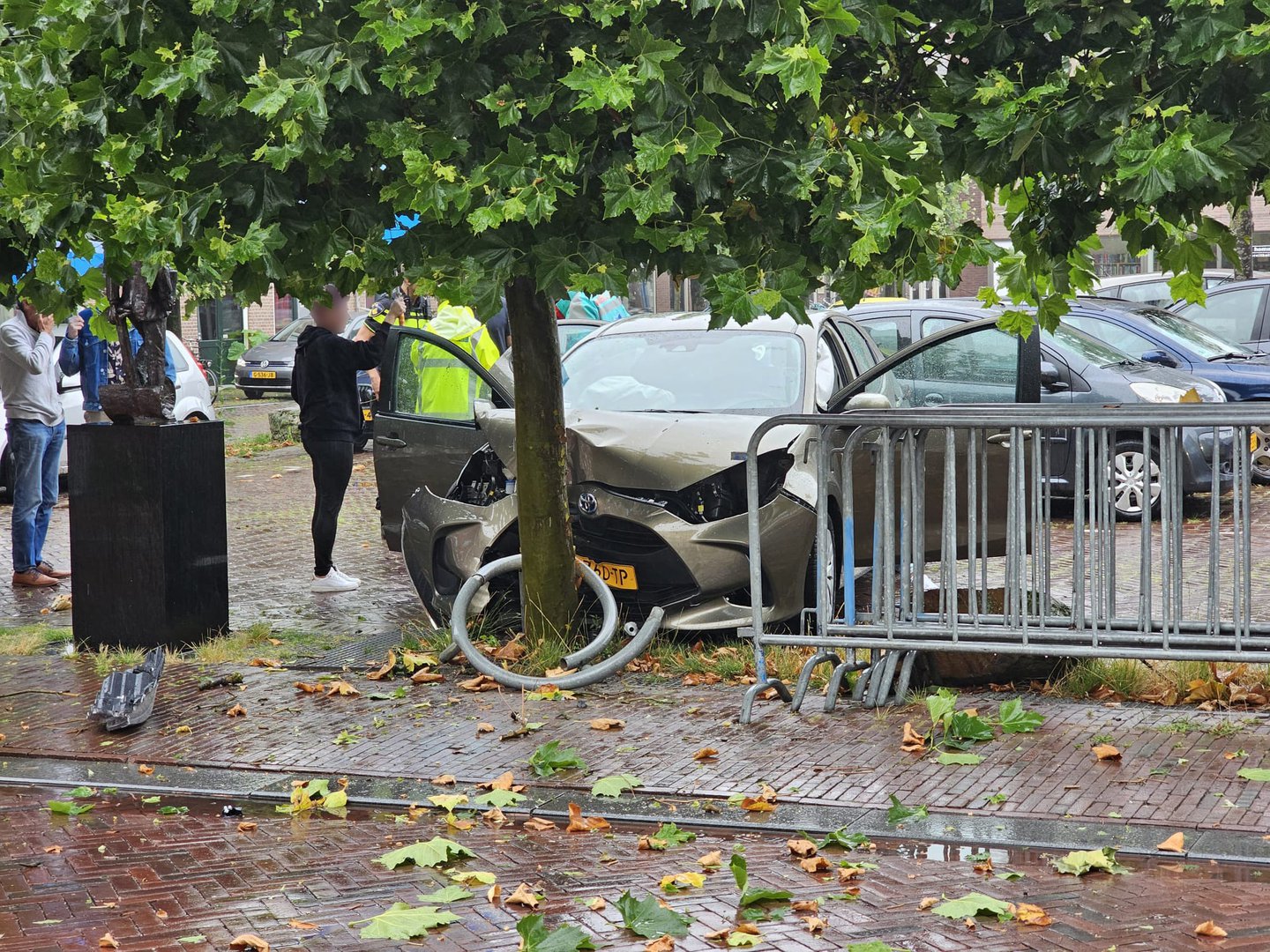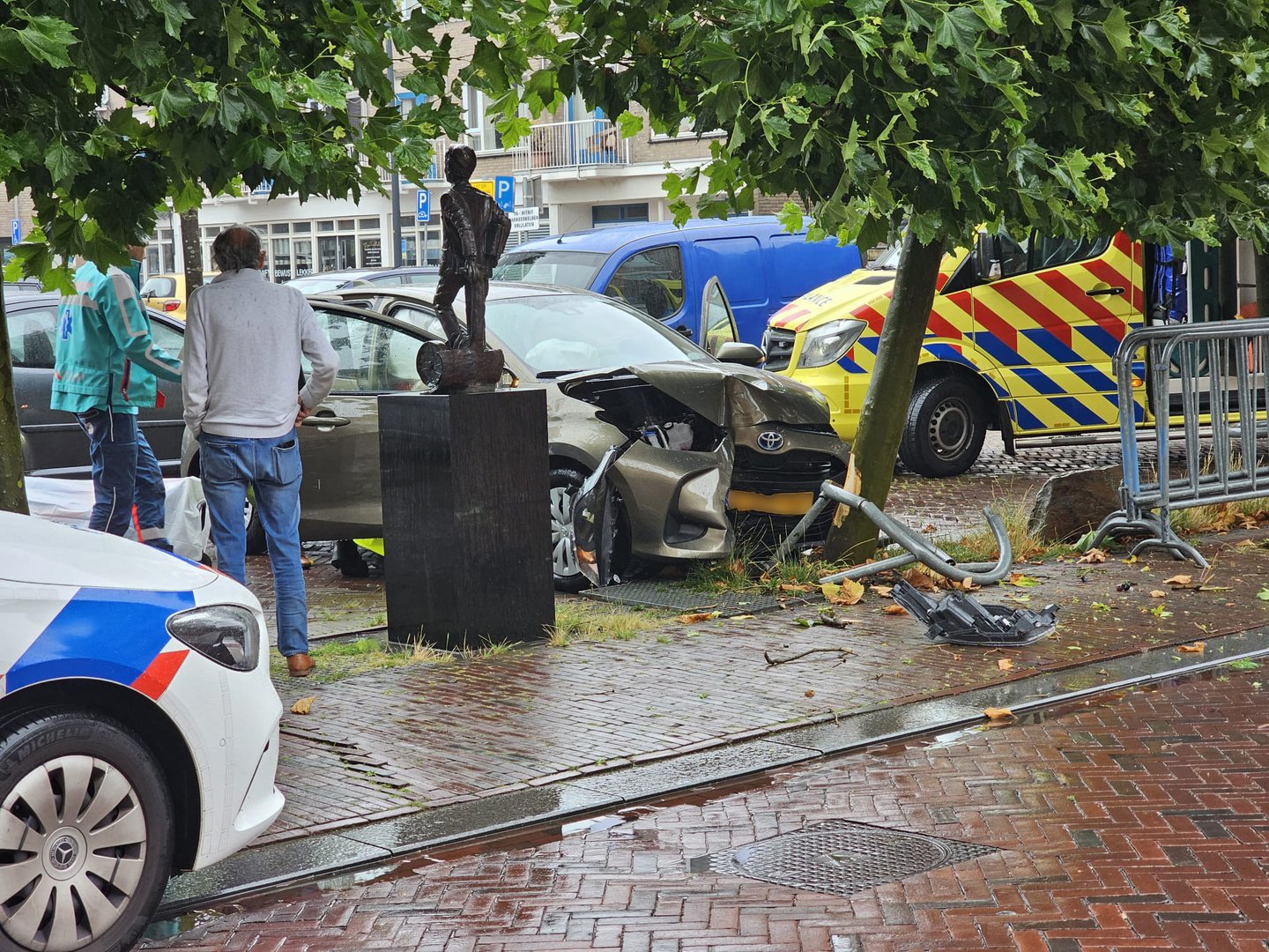 De gemeente is ter plaatse om de schade te herstellen en de auto wordt afgesleept.