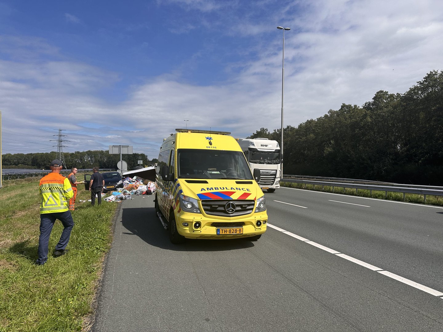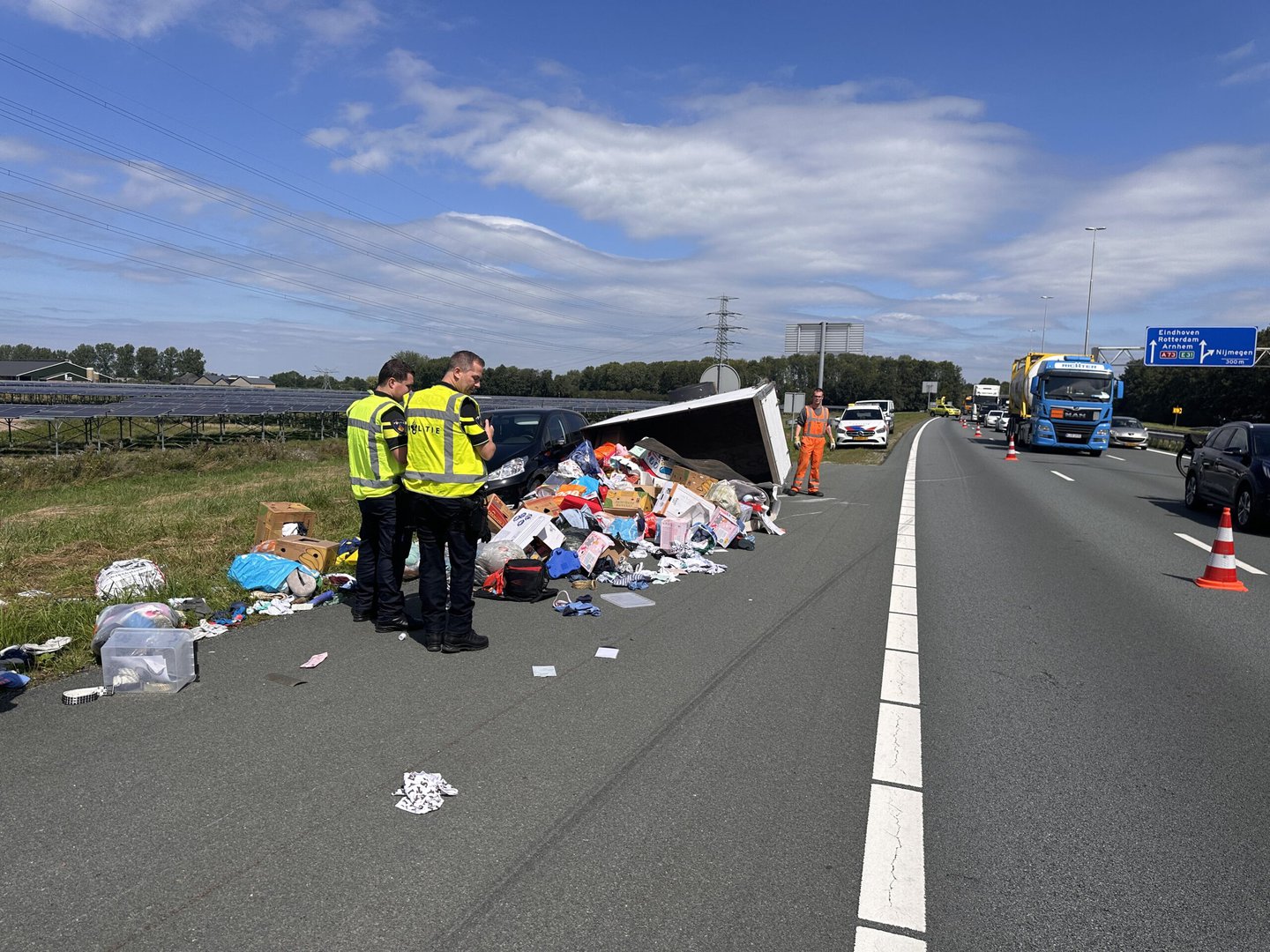 De lading belandde op de vluchtstrook. De bestuurder is met onbekend letsel naar het ziekenhuis vervoerd.