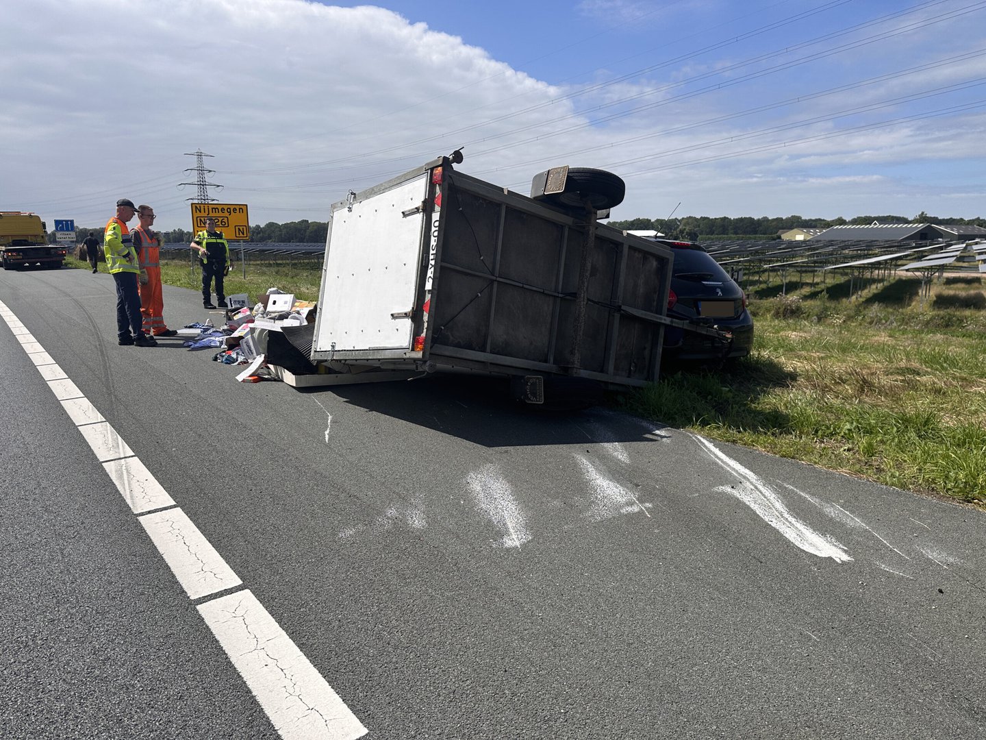 NIJMEGEN – Op donderdagmiddag omstreeks 12.30 uur kantelde een aanhangwagen op de A73 bij Nijmegen ter hoogte van de afslag Dukenburg. De bestuurder raakte de controle over het voertuig kwijt, waardoor de aanhanger omsloeg.