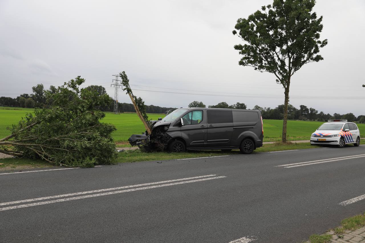 Bestelbus raakt boom en bestuurder naar ziekenhuis