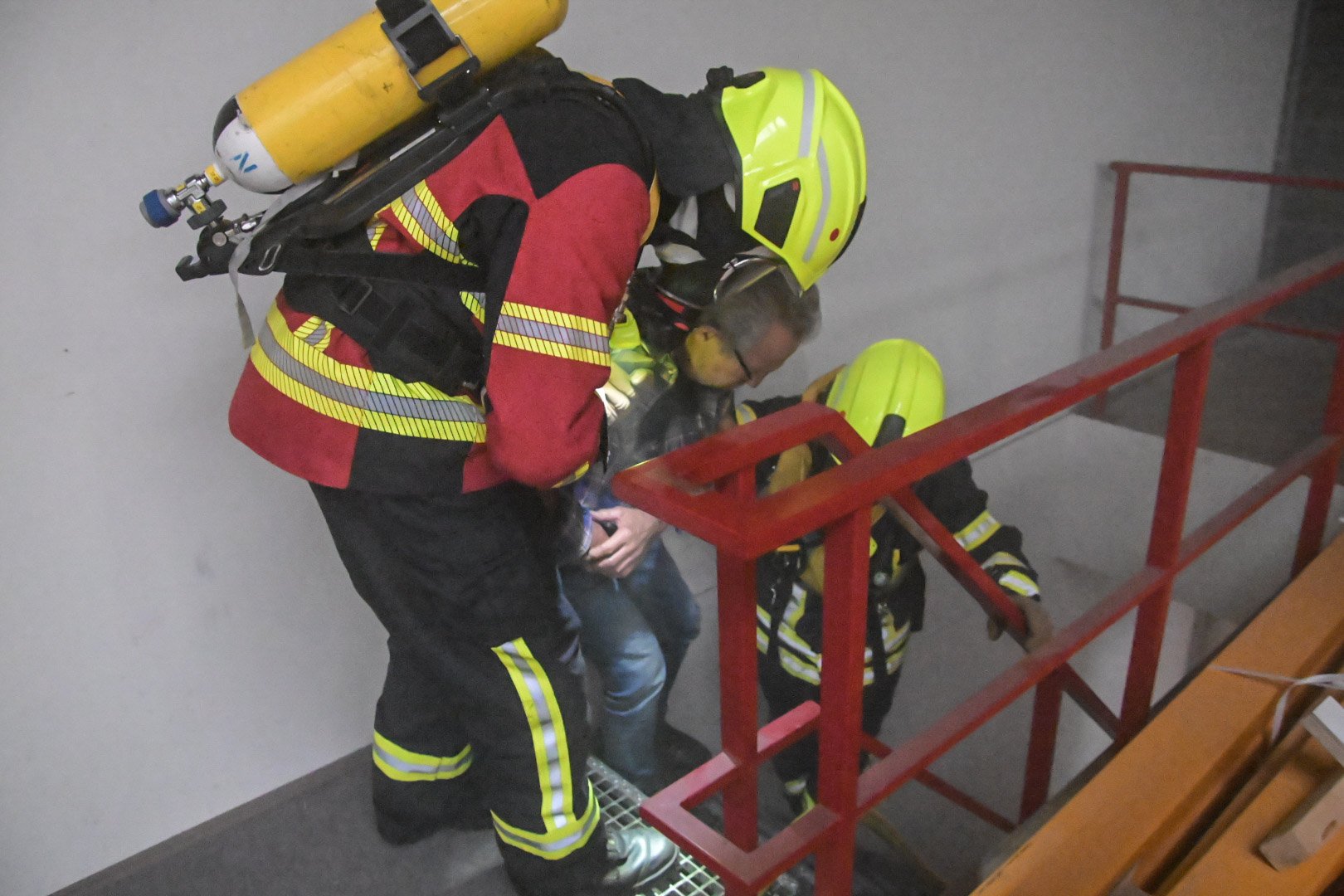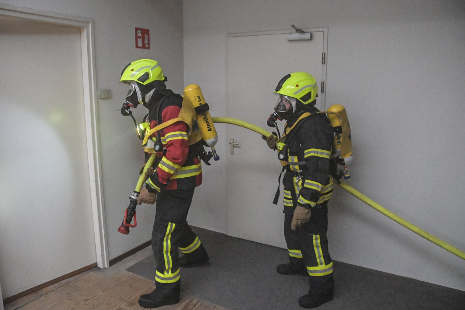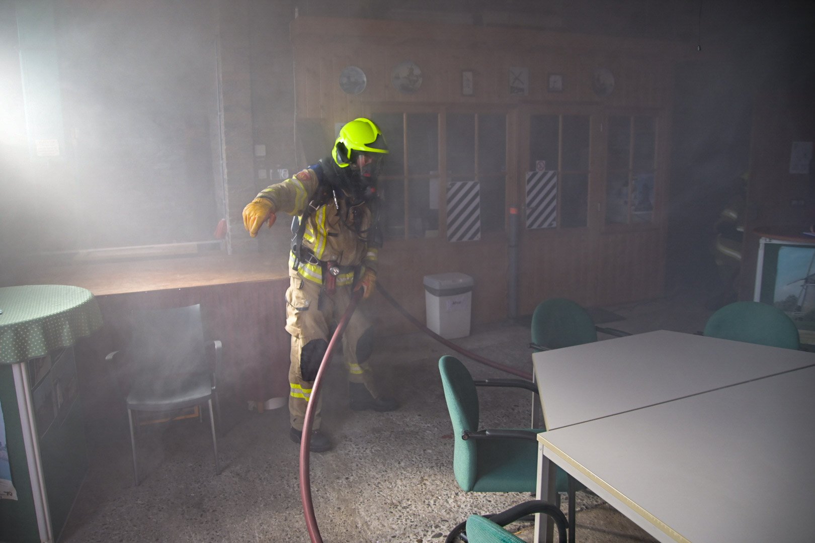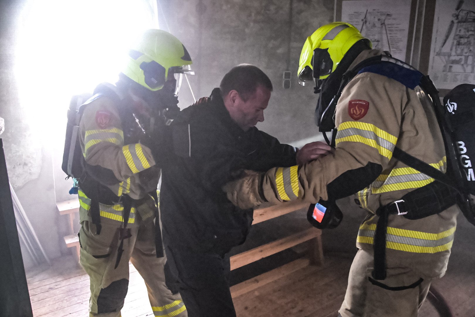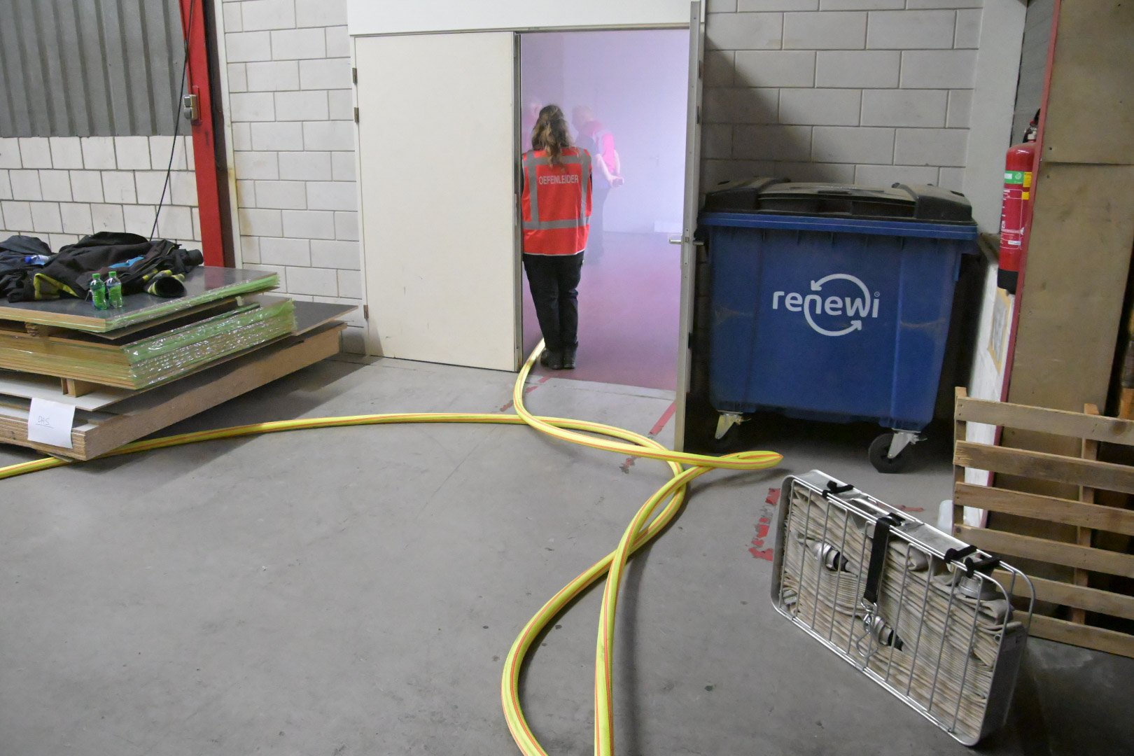 Op de Duitse baan viel een bouwlamp op de eerste verdieping op enkele stoelen, wat een brand veroorzaakte met rookontwikkeling die zich verspreidde naar de begane grond. Een medewerker probeerde de brand te blussen maar raakte bedwelmd door de rook. Op de begane grond was een andere medewerker bezig met zaagwerkzaamheden en verloor helaas zijn hand door een ongeluk met een cirkelzaag. Het was de taak van de teams om de slachtoffers, inclusief de verloren hand, in veiligheid te brengen en de brand te blussen.