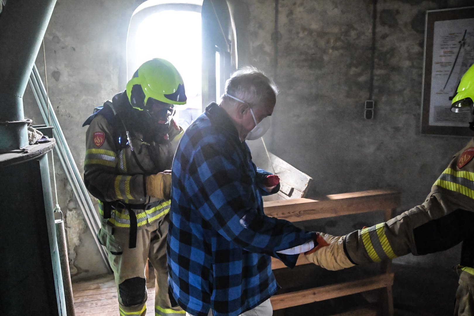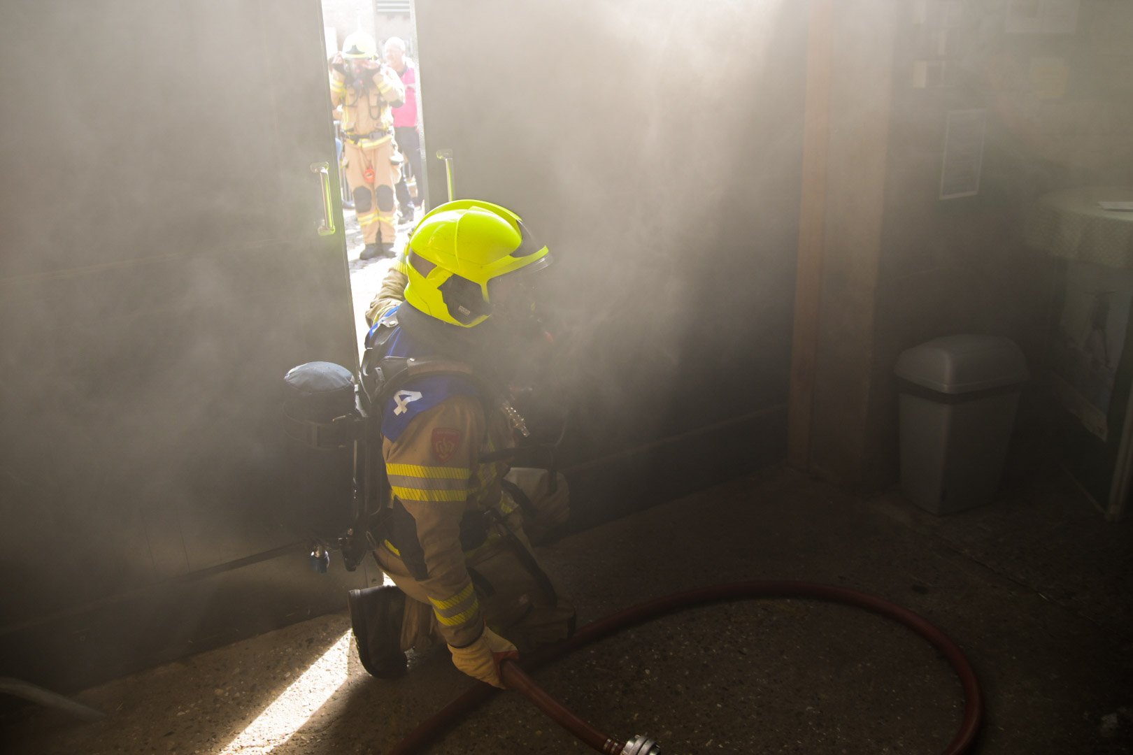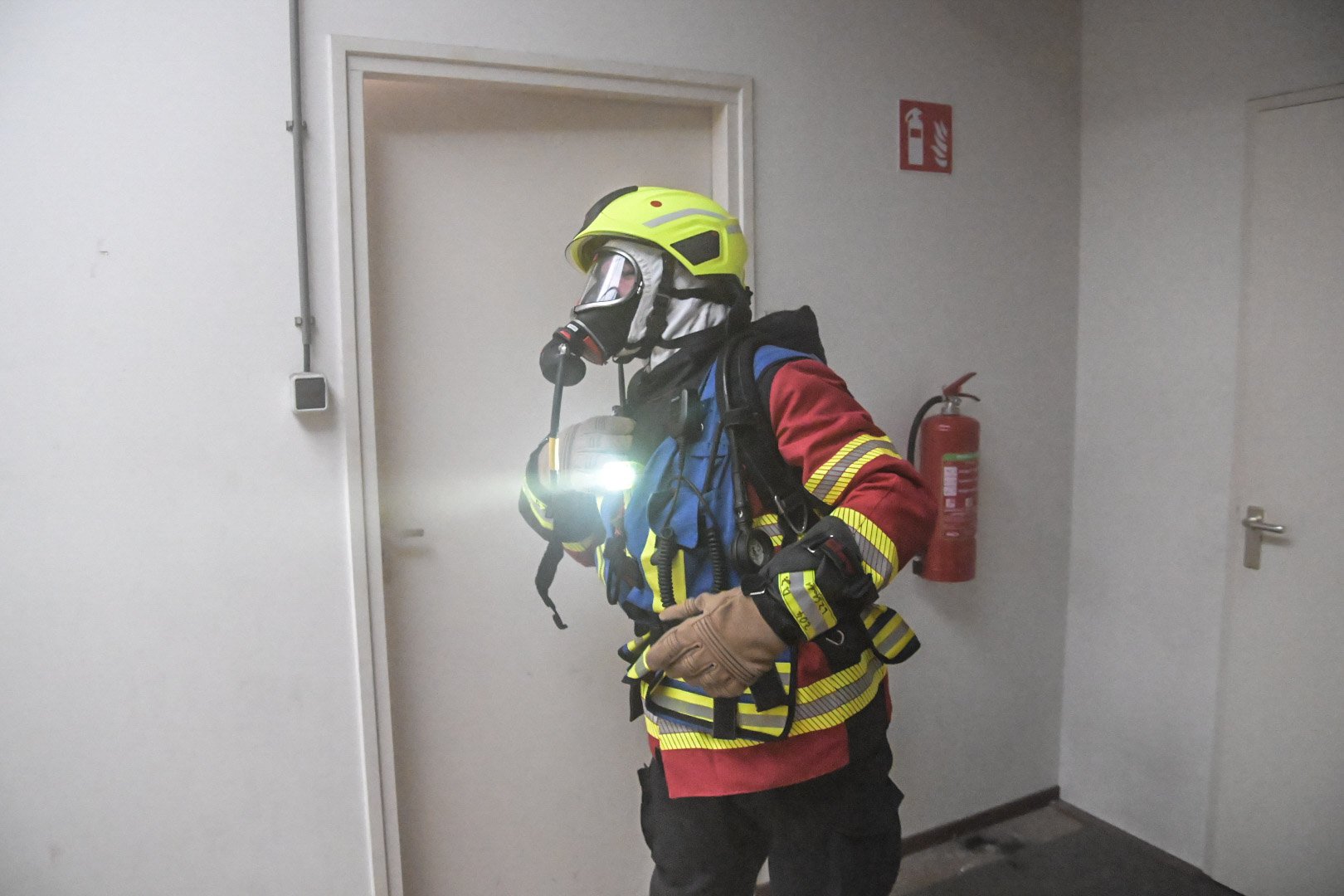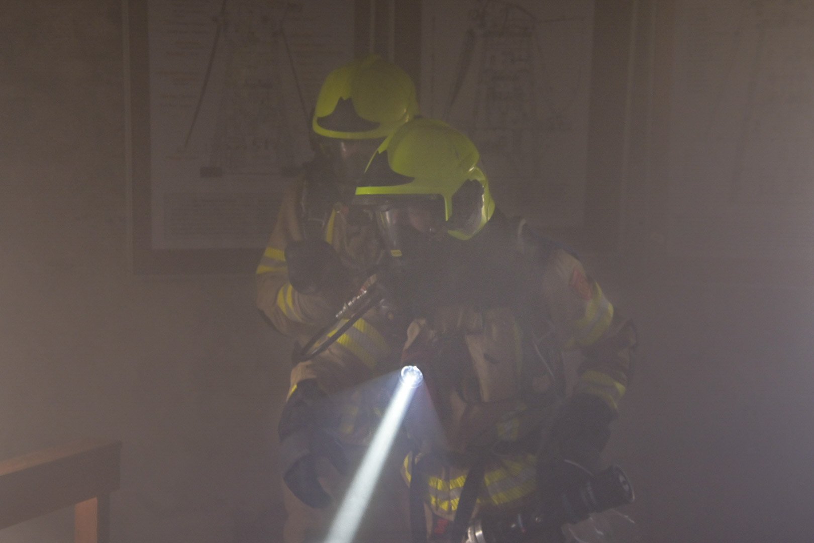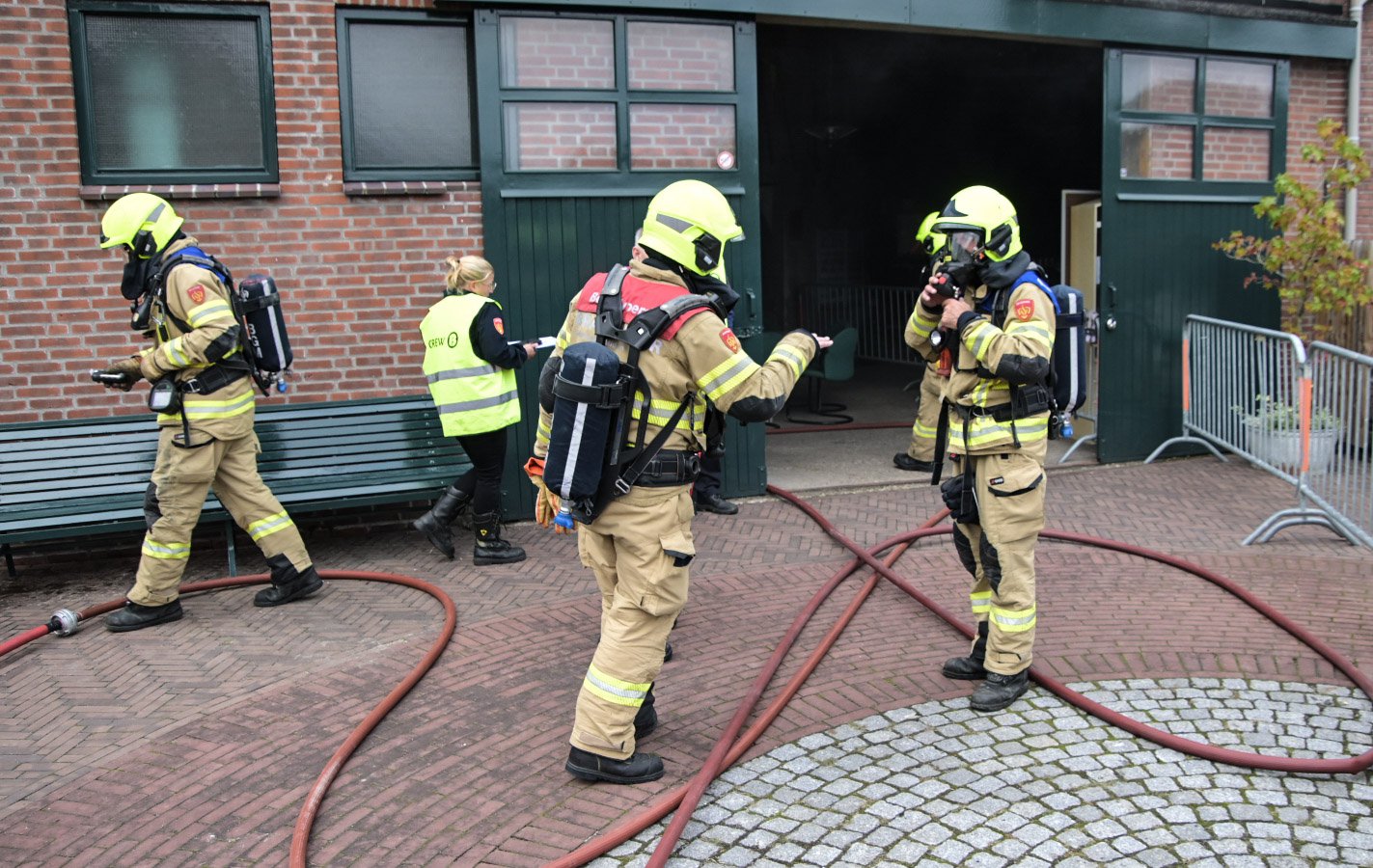 Op de Duitse baan viel een bouwlamp op de eerste verdieping op enkele stoelen, wat een brand veroorzaakte met rookontwikkeling die zich verspreidde naar de begane grond. Een medewerker probeerde de brand te blussen maar raakte bedwelmd door de rook. Op de begane grond was een andere medewerker bezig met zaagwerkzaamheden en verloor helaas zijn hand door een ongeluk met een cirkelzaag. Het was de taak van de teams om de slachtoffers, inclusief de verloren hand, in veiligheid te brengen en de brand te blussen.