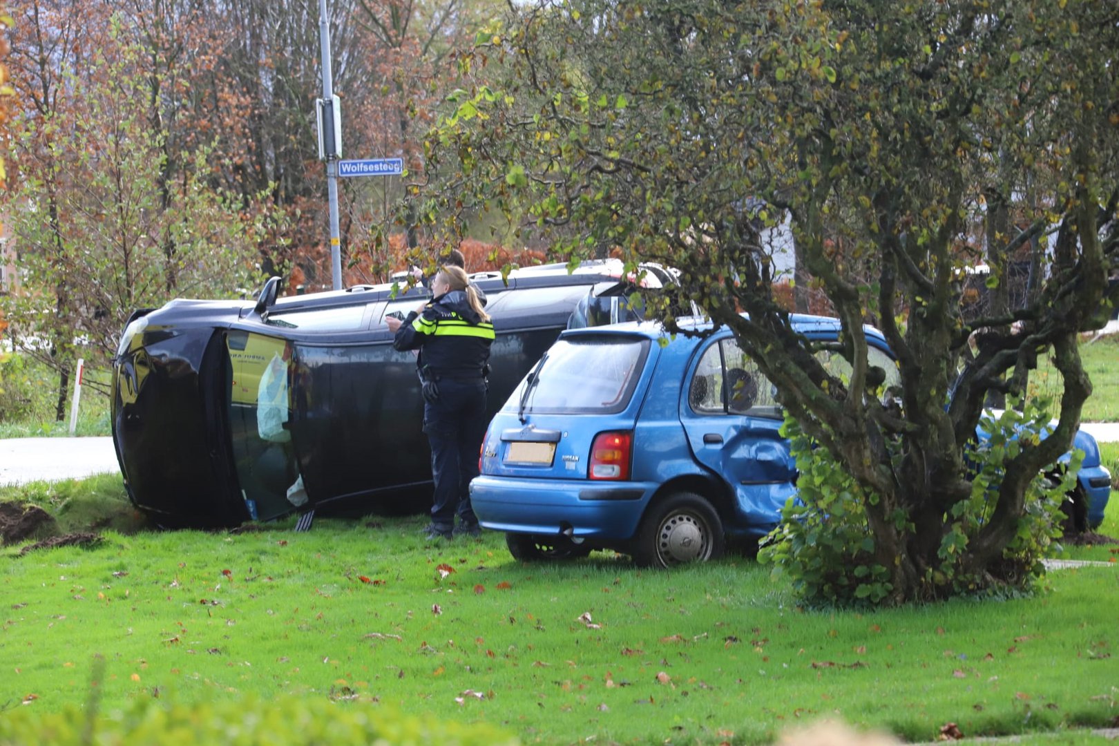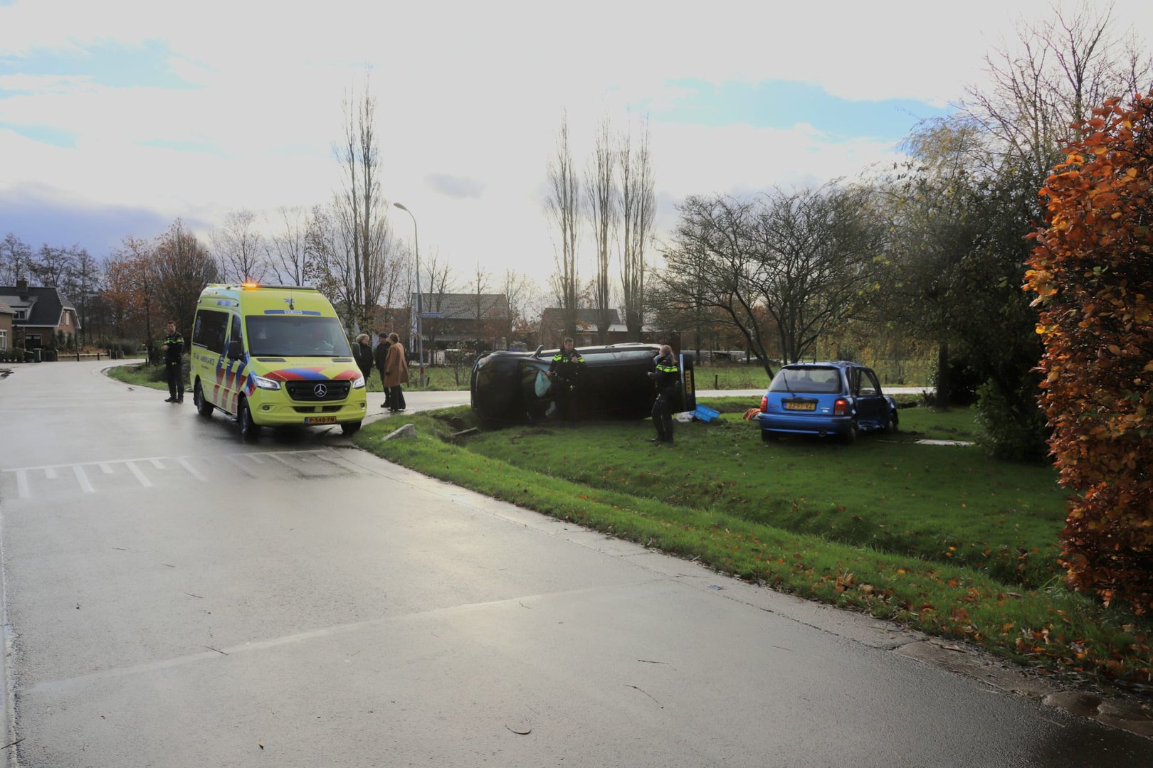 NIJKERKERVEEN – Op de kruising Schoolstraat met de Blokhuizersteeg zijn twee auto’s met elkaar in botsing gekomen. Door de klapt kwamen beide voertuigen in de tuin van een boerderij tot stilstand.