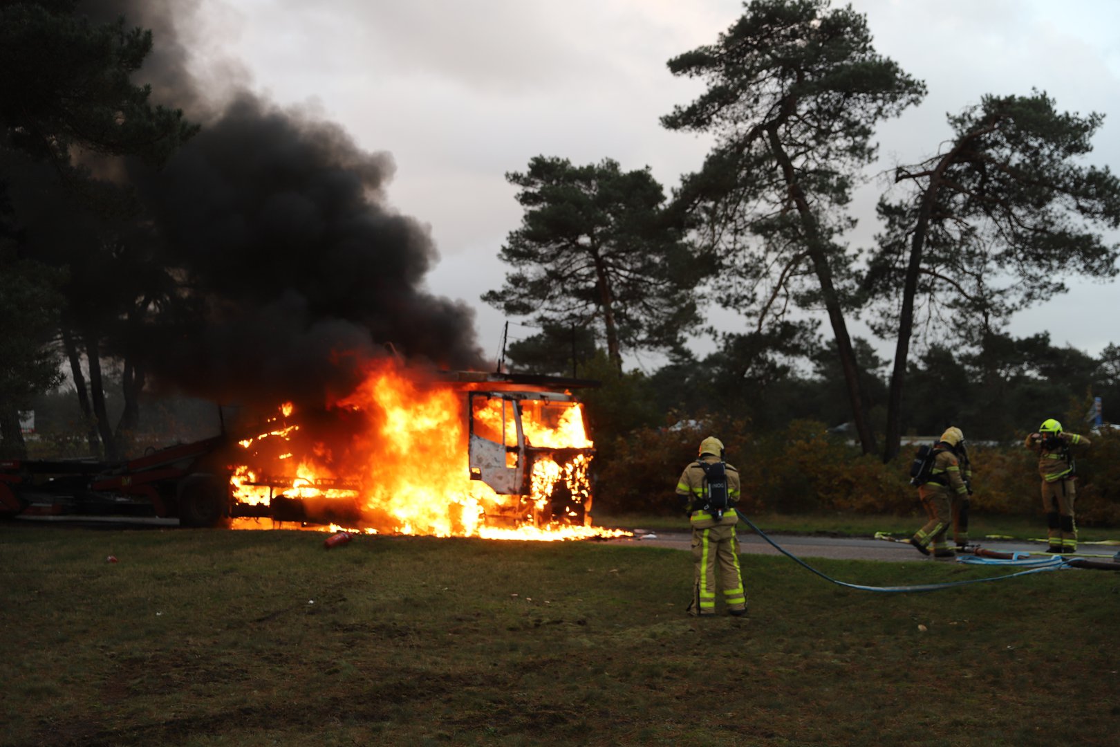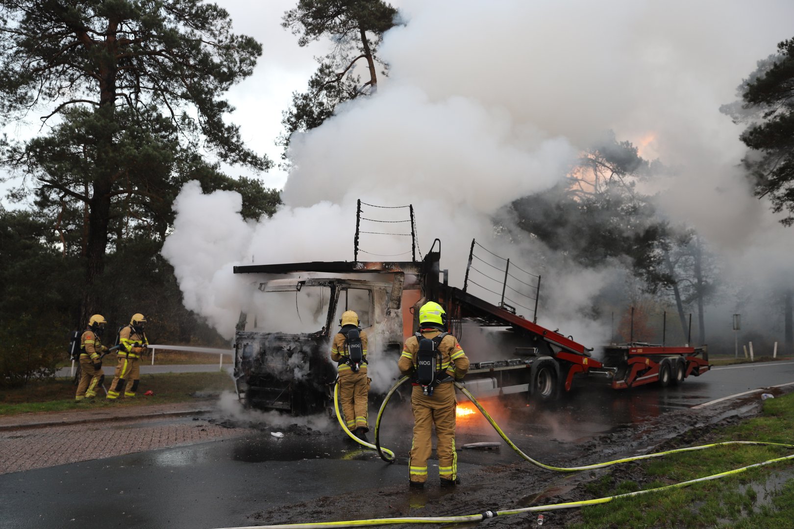 UDDEL – Een hevige vrachtwagenbrand heeft maandagmiddag plaatsgevonden op parkeerplaats De Strubben langs de A1 nabij Uddel. Rond 16:15 uur brak het vuur uit in een autotransporter. De brandweer is snel ter plaatse gekomen met een bluswagen en twee waterauto’s om de vlammen te doven.