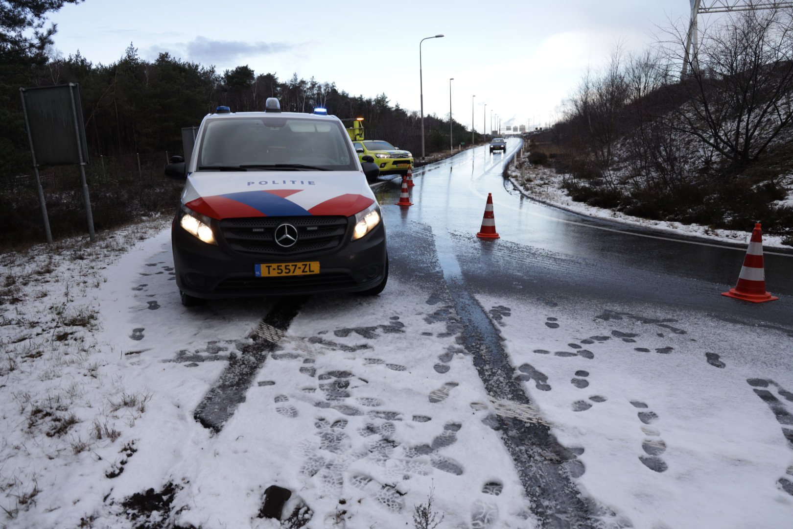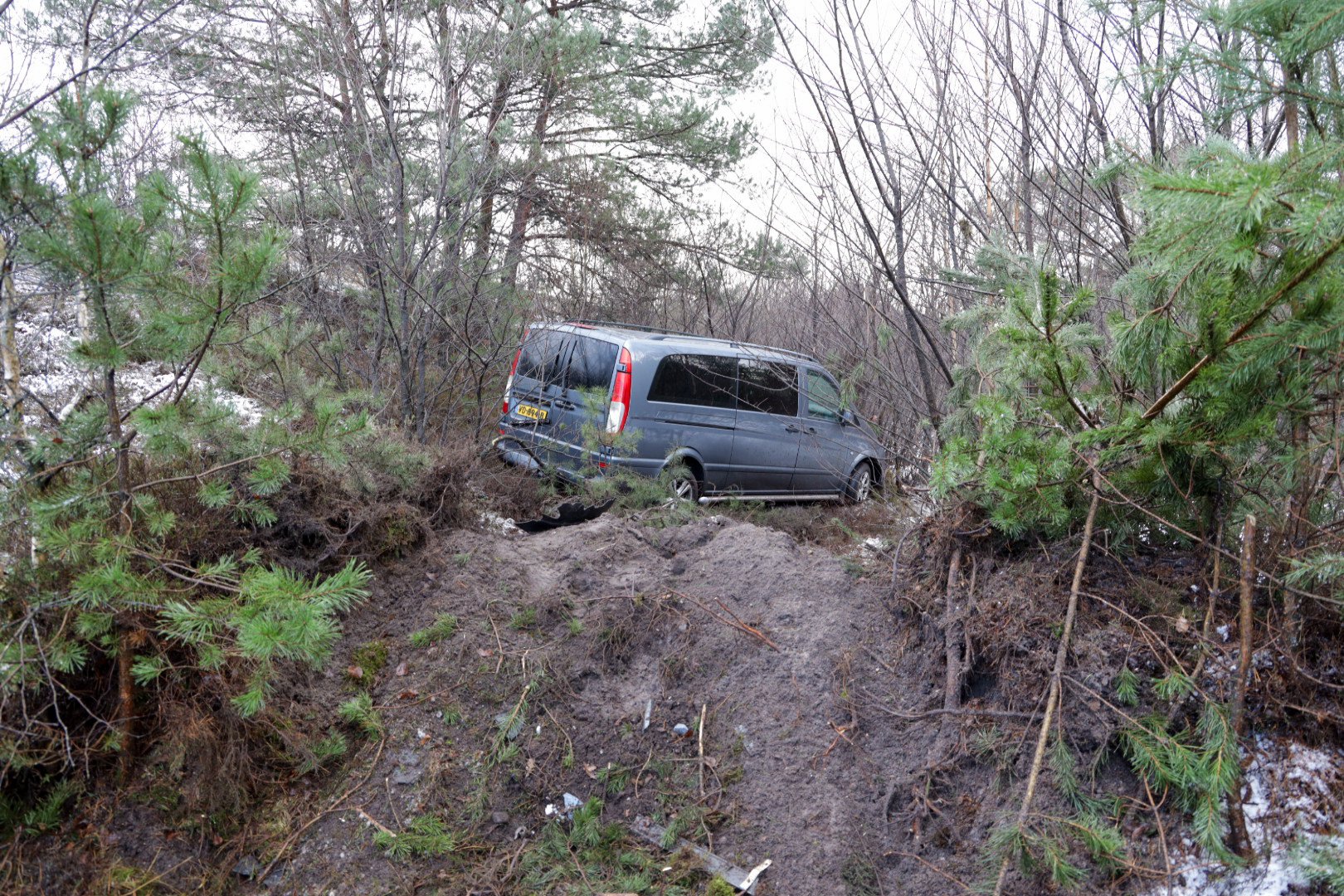 Tijdens een sneeuwbui miste de bestuurder van een grijze bestelbus de bocht en kon niet meer op tijd remmen. Het busje vloog de berm in over een heuvel en kwam enkele meters verder in de bosjes tot stilstand. De man raakte gewond aan onder andere zijn hoofd en is behandeld door ambulance personeel en daarna naar het ziekenhuis vervoerd.