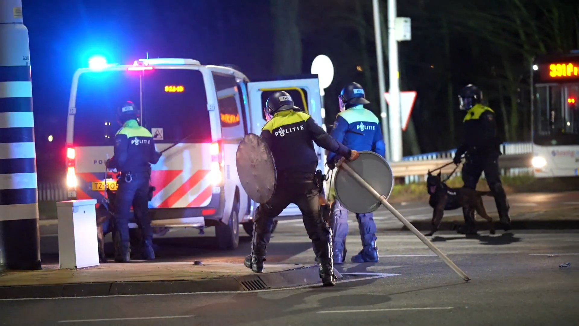 Ook op de grote kruising werd een verkeerspaal naar de politie gegooid. De politie verdreef de relschoppers uiteindelijk richting de Rijnhal.